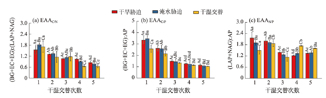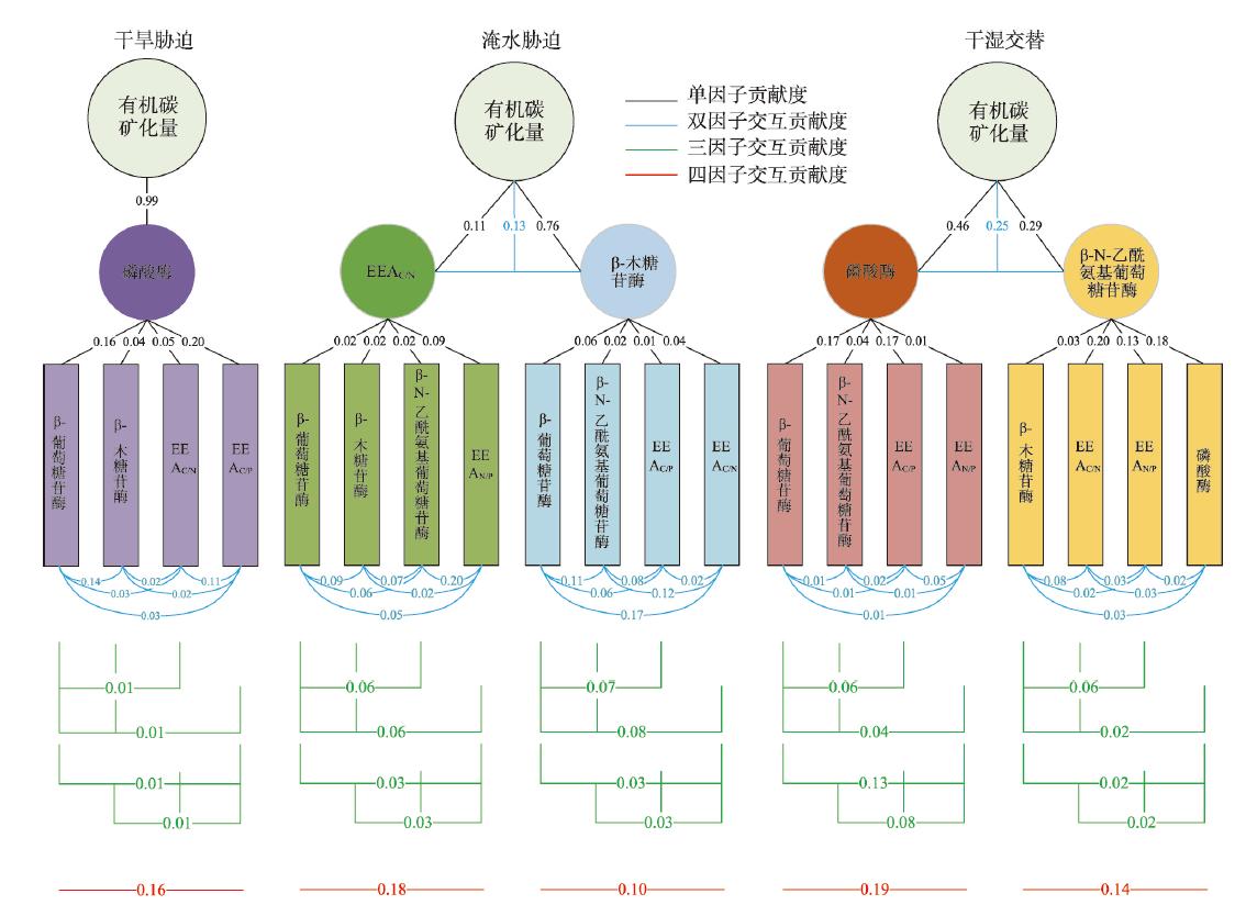 气候变化导致长期干旱和强降雨事件的发生频率增加,从而对生态系统碳循环产生影响。因此,了解不同干湿条件土壤酶活性如何影响有机碳矿化,能够帮助深入理解碳循环机制并推进全球碳中和目标达成。据此,本研究选择黄土高原特有的控制侵蚀所修建的淤地坝为研究对象,并设计淹水胁迫、干旱胁迫和干湿循环3种处理监测土壤酶活性及有机碳矿化过程。结果表明:干湿循环对有机碳矿化存在瞬时激发效应,且有机碳累积矿化量介于干旱胁迫和淹水胁迫之间。同时干湿循环均会增加碳循环和氮循环相关酶活性,但随着循环次数的增加酶活性逐渐降低并趋于稳定。三种水分处理条件下酶活性均受到碳和磷的限制,而干湿循环次数越多碳限制越强烈,第四次干湿交替后干湿交替条件下磷限制作用超过淹水胁迫和干旱胁迫。当土壤处于干旱、淹水胁迫以及干湿循环时,限制有机碳矿化的酶活性因子也各不相同。干旱胁迫下磷酸酶因子的直接作用为99%,淹水胁迫下EAAC/N(碳循环相关酶/氮循环相关酶)和木糖苷酶因子的直接作用为87%,干旱胁迫和淹水胁迫下因子间交互作用仅为1%和13%。干湿循环条件下,磷酸酶和β-N-乙酰氨基葡萄糖苷酶因子的直接作用为75%,因子间交互作用为25%,干湿循环可以显著增加因子之间的相互联系。本研究可为明晰黄土高原淤地坝建设在国家碳中和目标中发挥的作用提供理论支撑。