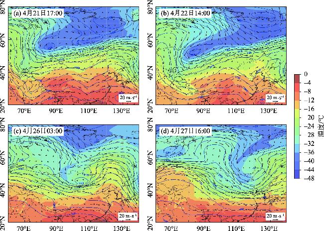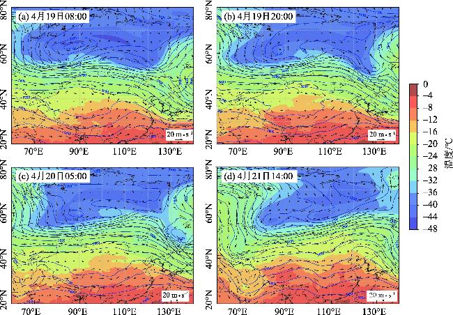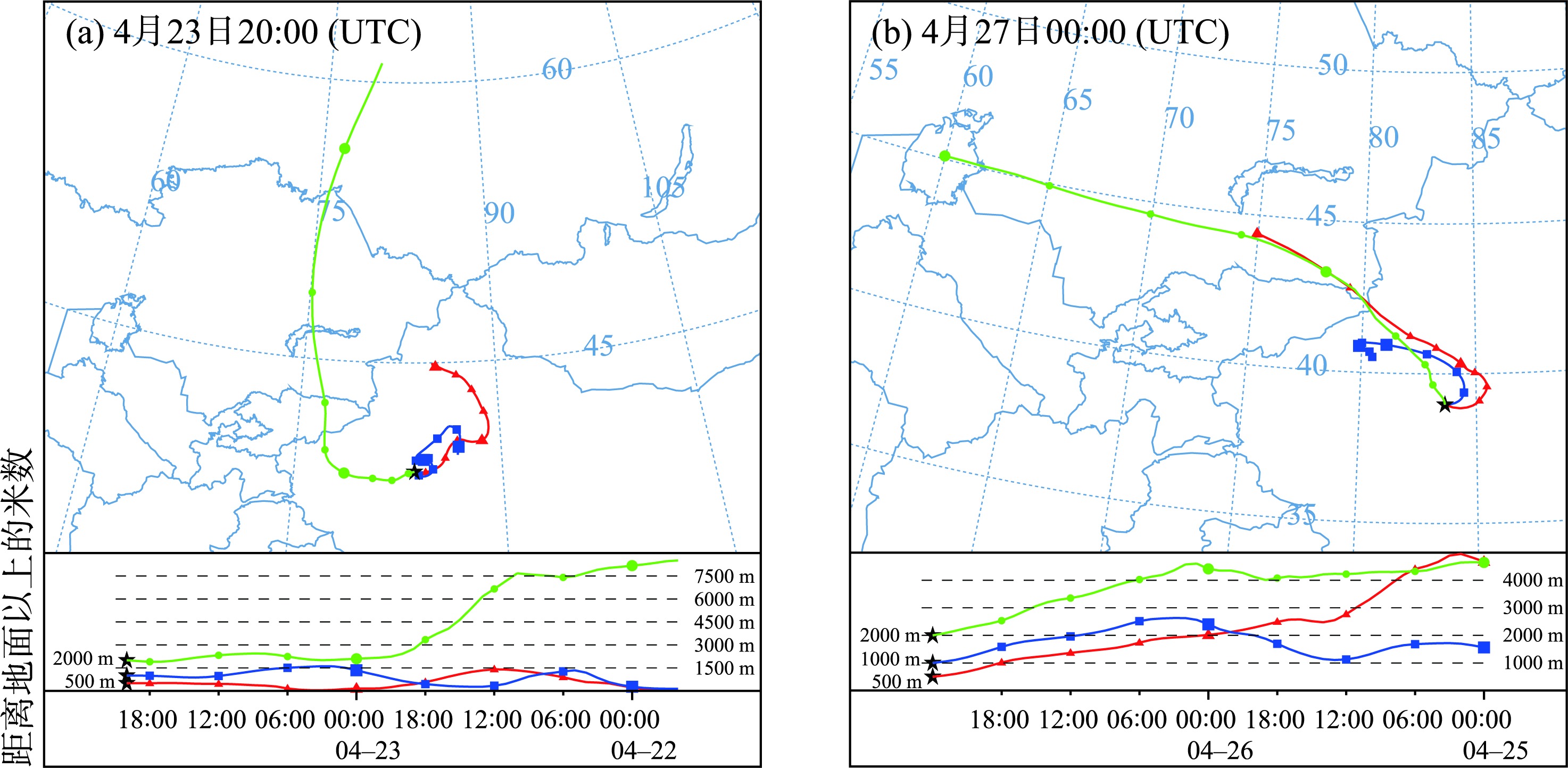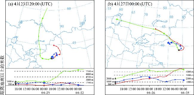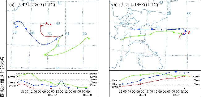 图9 HYSPLIT模拟的第一次沙尘天气期间塔中气团后向轨迹注:图a表示4月19日23:00(UTC)48 h后向轨迹。下同。 Fig. 9 Backward trajectory of air mass in Tazhong during the first dust weather simulated by HYSPLIT |