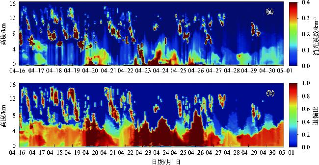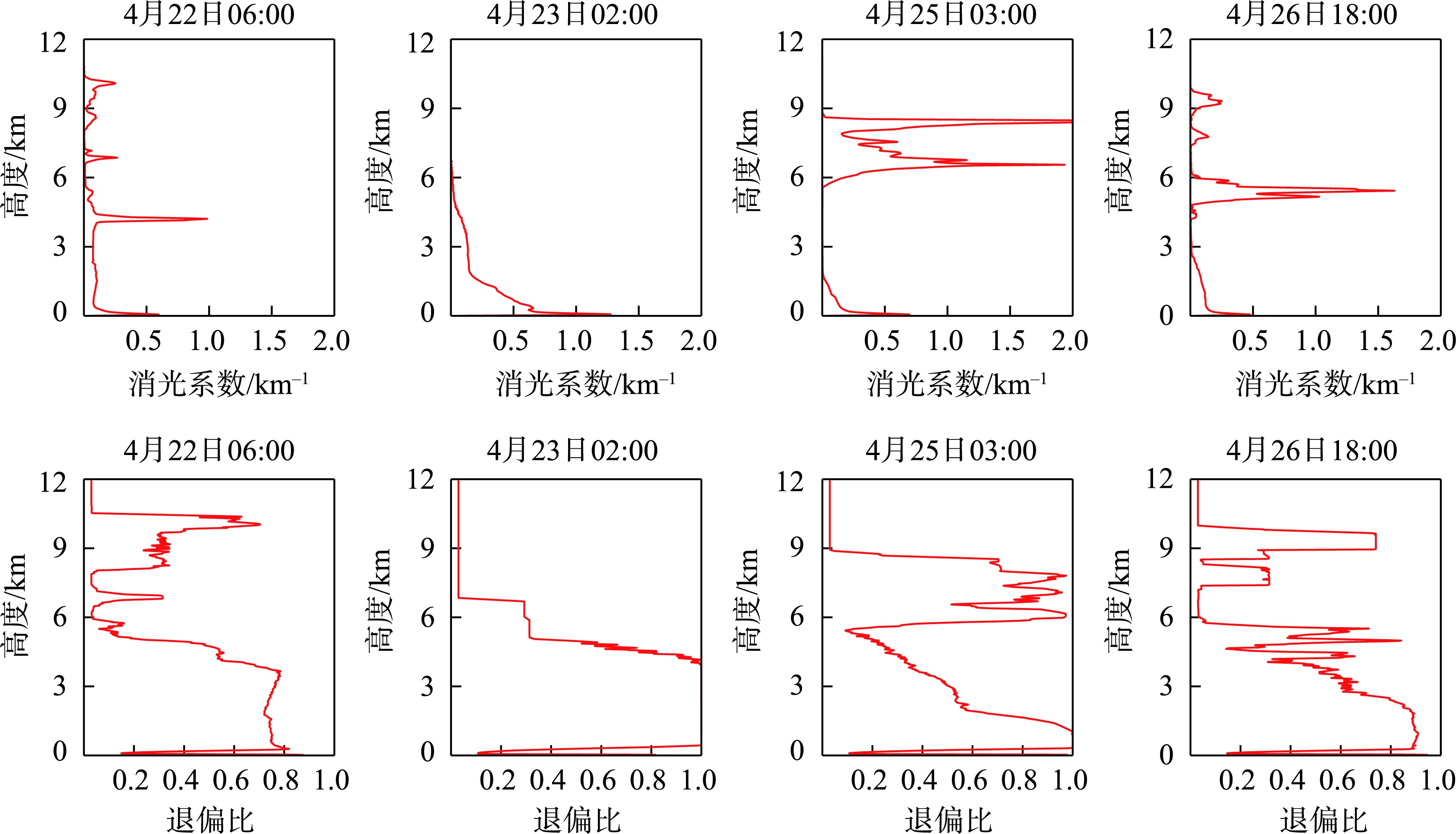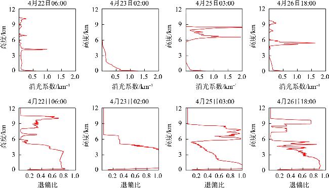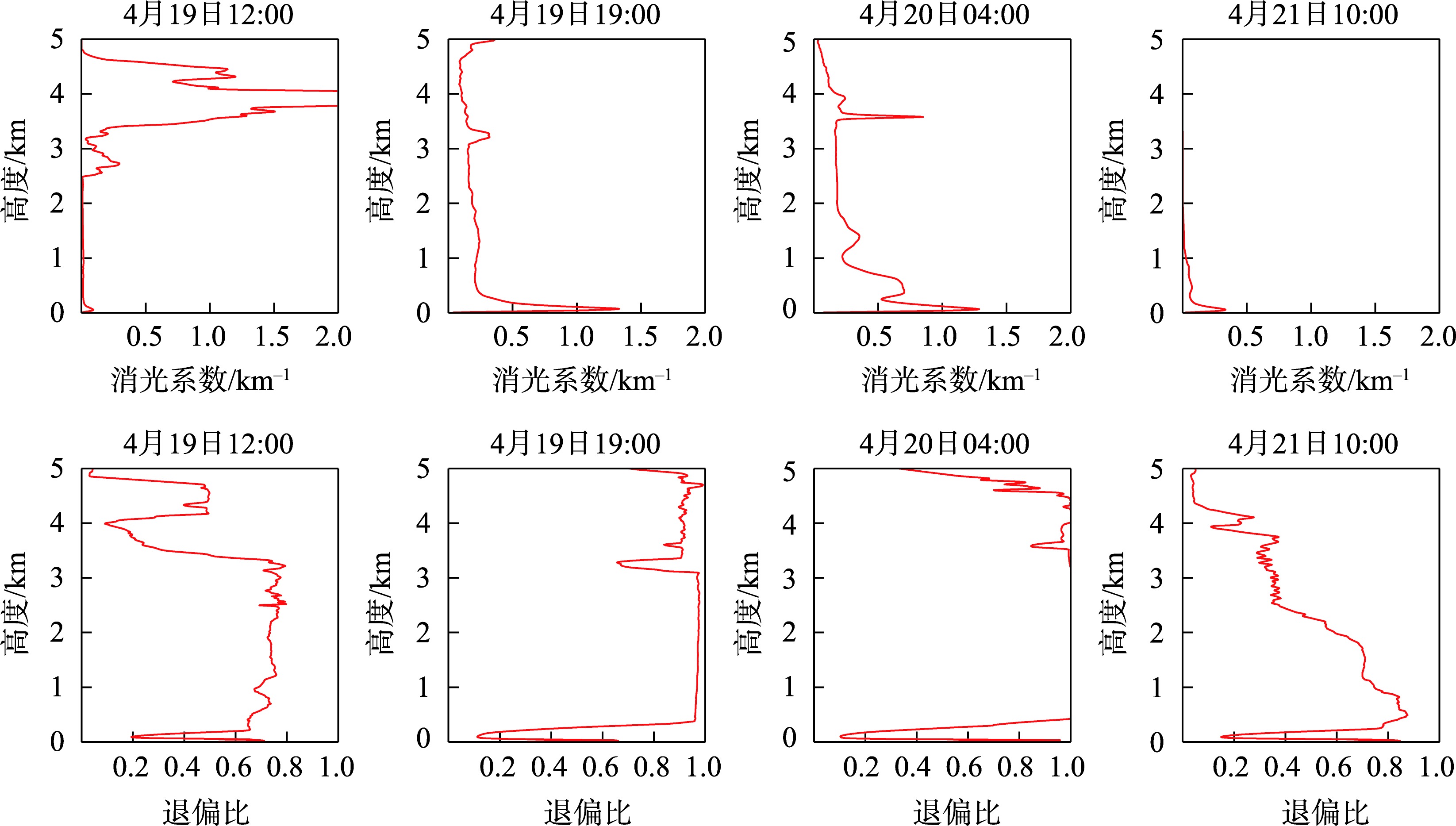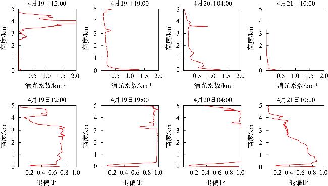 图3 第一次沙尘天气过程4个典型时刻消光系数和退偏比廓线Fig. 3 Profile of extinction coefficient and depolarization ratio at four typical moments of the first dust weather process |