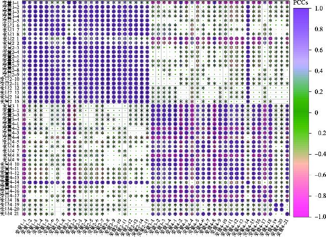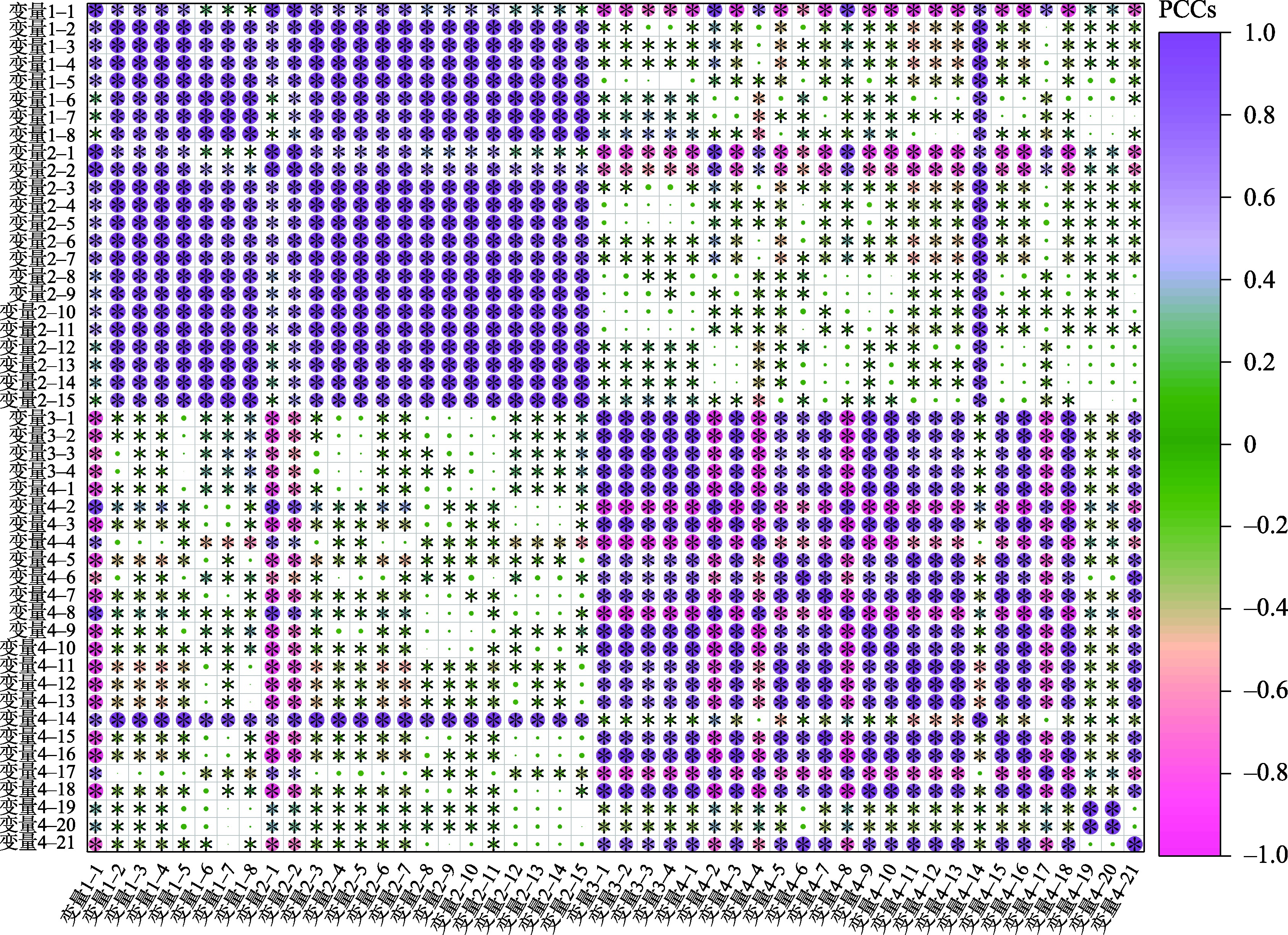 图7 分类变量相关系数热力图注:*表示P值在0.1水平下,两变量存在显著相关性。变量1-1至1-8表示2.1节筛选的8个波段;变量2-1到变量2-15表示2.2节筛选的15个波长;变量3-1:446~600 nm吸收谷深度;变量3-2:446~600 nm吸收谷面积;变量3-3:2150~2285 nm吸收谷深度;变量3-4:2150~2285 nm吸收谷面积;变量4-1至变量4-21为2.4节中的21种光谱植被指数,其顺序与该节所列顺序对应。 Fig. 7 Heat map displaying correlation coefficients of categorical variables |