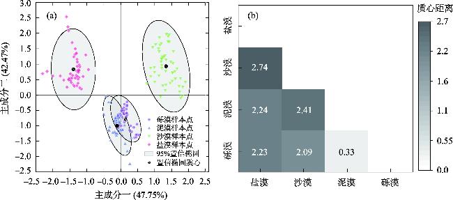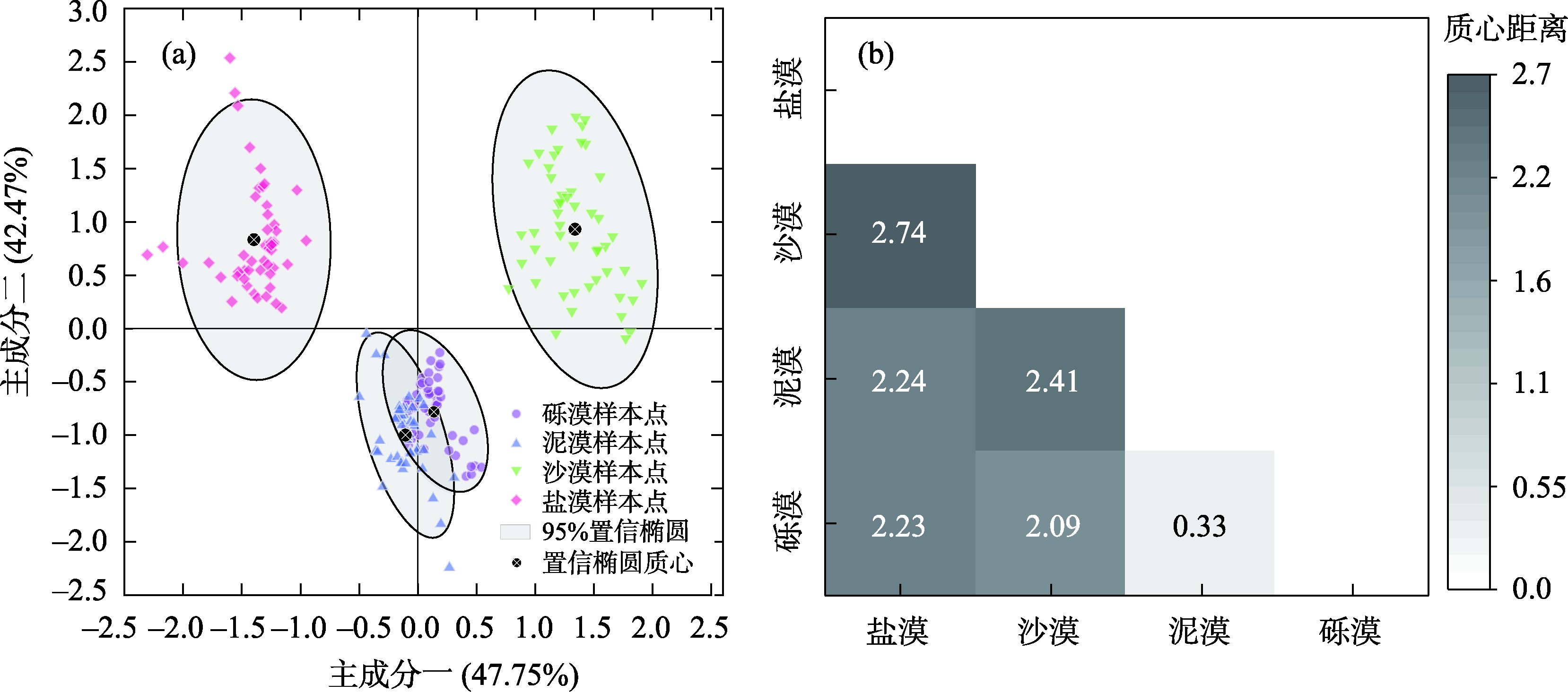 本研究采用裸土高光谱反射曲线细节所提取的特征变量评价不同荒漠类型可分性,选择石羊河下游盐漠、砾漠、泥漠和沙漠为研究对象,运用累积差值、一阶微分、包络线去除、植被指数计算、主成分分析法等,辨别不同荒漠类型的高光谱反射特征,提取关键分类变量,量化不同荒漠类型区分度。结果表明:(1) 各荒漠类型在446~600 nm和2150~2285 nm处存在差异明显的吸收谷。(2) Carter指数1、绿度指数(GI)、绿色归一化植被指数(GNDVIh2)等在不同荒漠类型间存在显著差异。(3) 改进叶绿素吸收指数(MCARI)、土壤调整植被指数(SAVI)、2265 nm与1790~1810 nm反射率在主成分指标构建中的权重值较大。(4) 各荒漠类型区分度:沙漠&盐漠>沙漠&泥漠>泥漠&盐漠>砾漠&盐漠>沙漠&砾漠>泥漠&砾漠。研究结果可为西北干旱区荒漠遥感监测提供地面验证和数据支持。