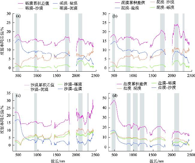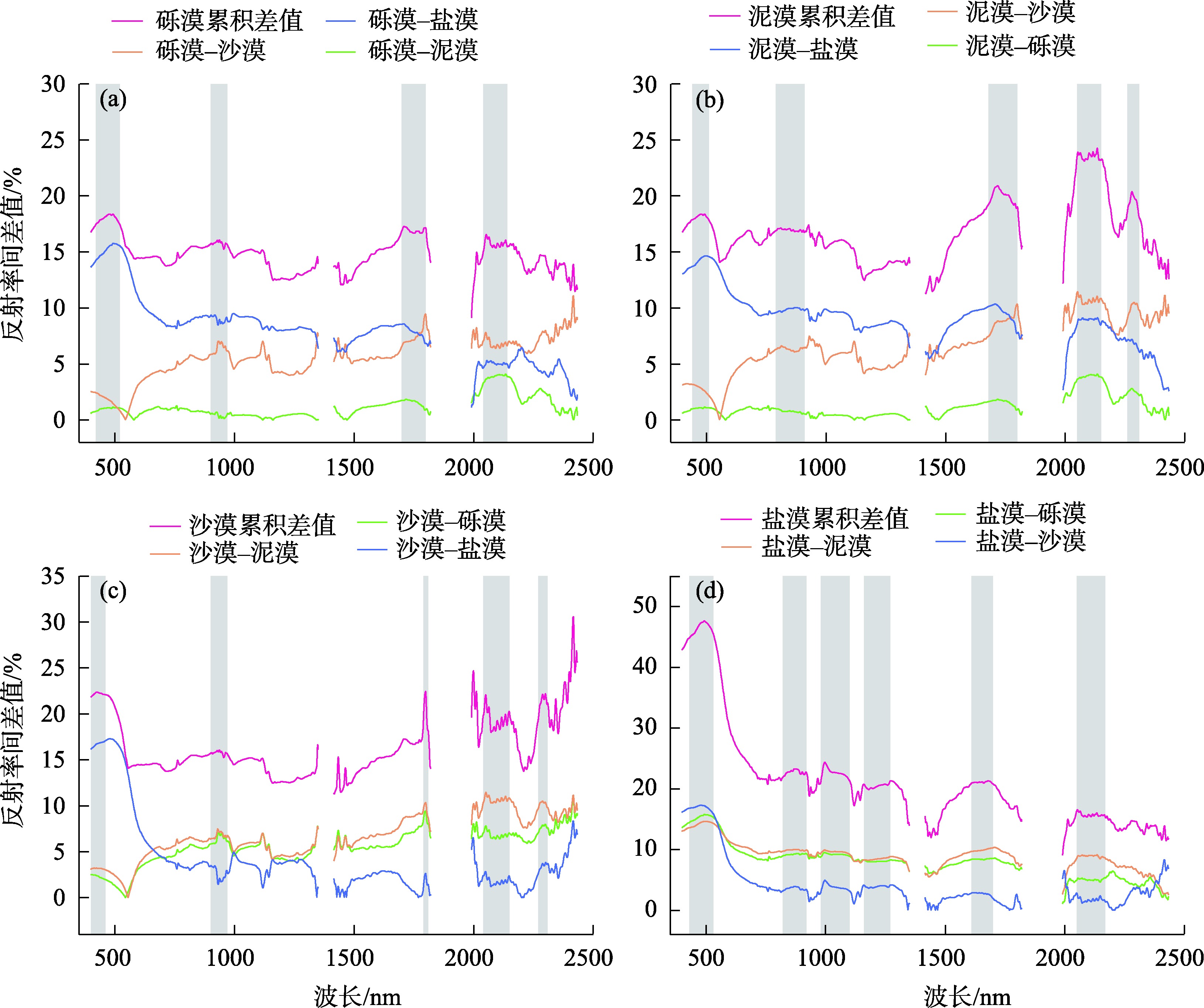 图4 不同荒漠类型间的光谱反射率累积差注:“砾漠-泥漠”表示砾漠与泥漠光谱曲线差值,其他表示含义类似。 Fig. 4 Cumulative difference of spectral reflectance within deserts |