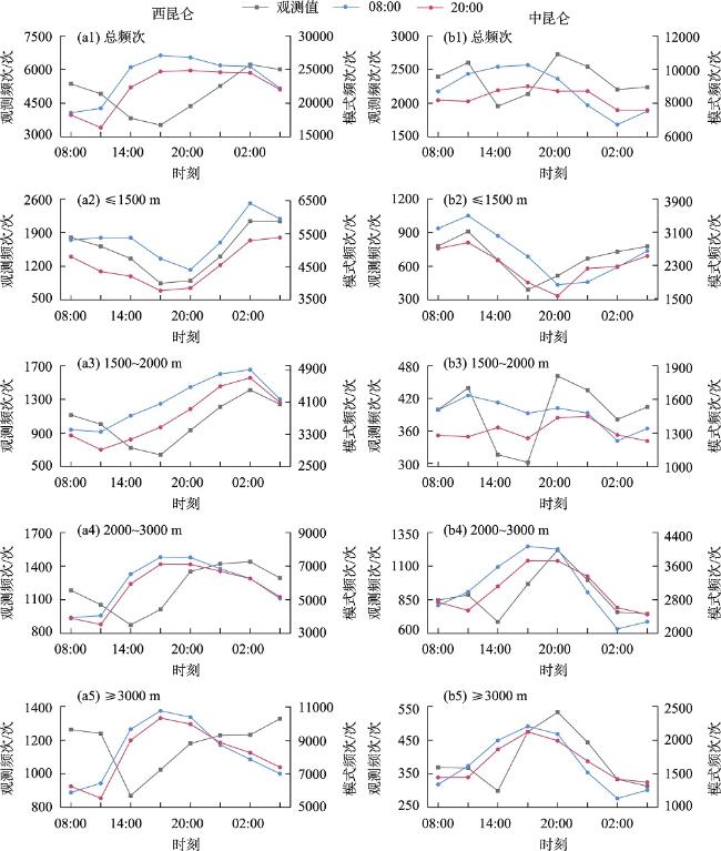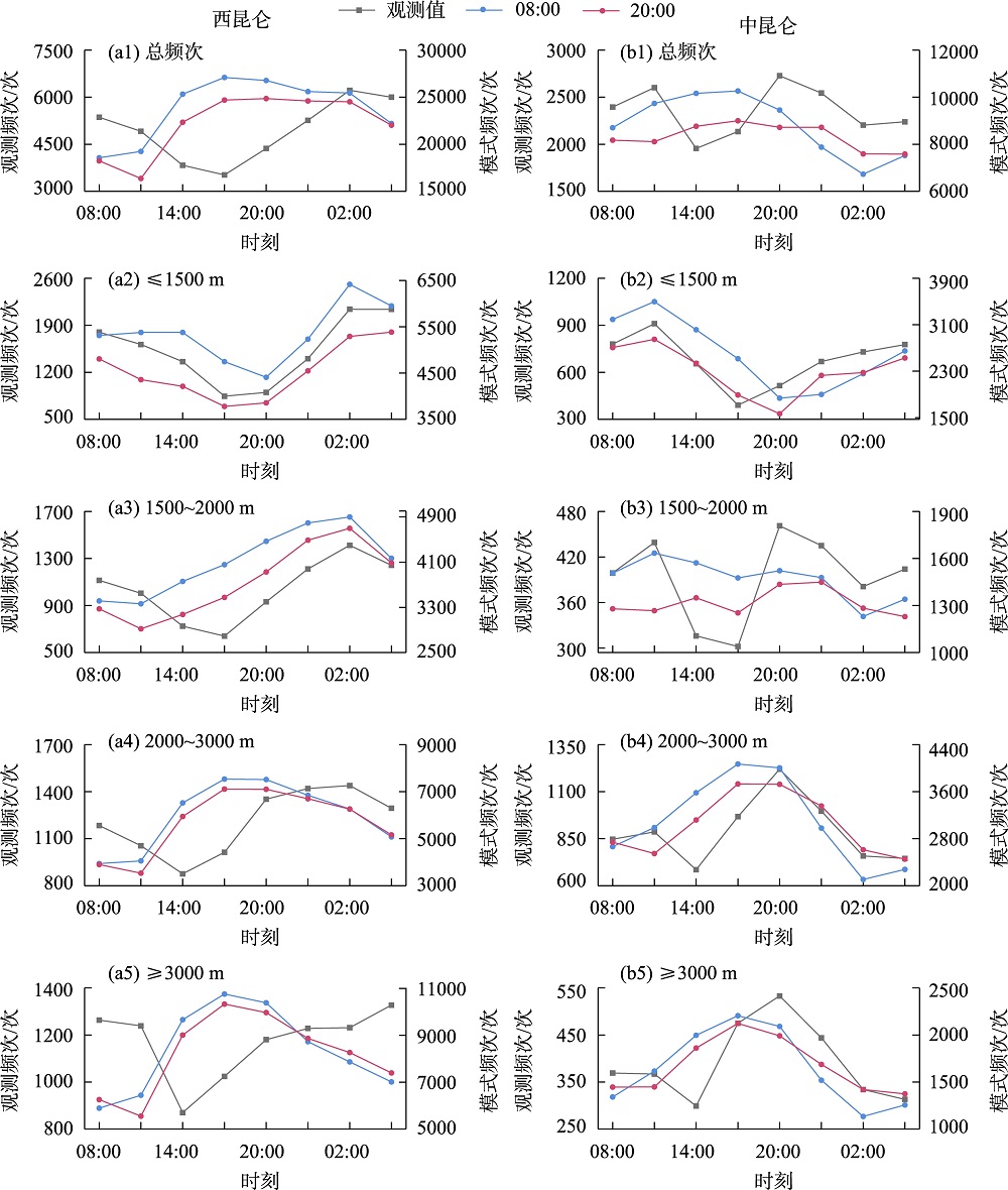 昆仑山北坡地形复杂,降水日变化特征独特导致其降水精细化预报难度大,准确率低。ECMWF模式的整体预报性能世界领先,但其对昆仑山北坡复杂地形下降水日变化特征的预报能力尚不明确。本文利用2020—2023年夏季自动气象站降水观测资料,检验评估了ECMWF模式对昆仑山北坡不同区域夏季降水日变化特征的预报性能。结果表明:(1) 模式20:00起报的24 h累计降水预报性能优于08:00,模式对昆仑山北坡海拔大于2000 m区域的降水预报能力优于海拔小于2000 m的区域,模式对西昆仑山北坡降水的捕捉能力优于中昆仑山北坡。(2) 模式降水量与观测降水量的日变化特征差异在17:00至次日02:00最大,模式降水频次明显多于观测值,降水强度明显小于观测值,在观测降水较少(多)时段,模式降水易高(低)估;西(中)昆仑山北坡海拔>2000 m(≤2000 m)区域的模式降水量日变化特征与观测降水量的差异较大。(3) 模式降水在西昆仑山北坡以对流性降水预报为主,在中昆仑山北坡以大尺度降水预报为主;模式降水与观测降水日变化特征的误差主要来自对流性降水预报。研究成果可为提高昆仑山北坡夏季降水预报准确率和ECMWF模式降水预报产品订正提供参考。