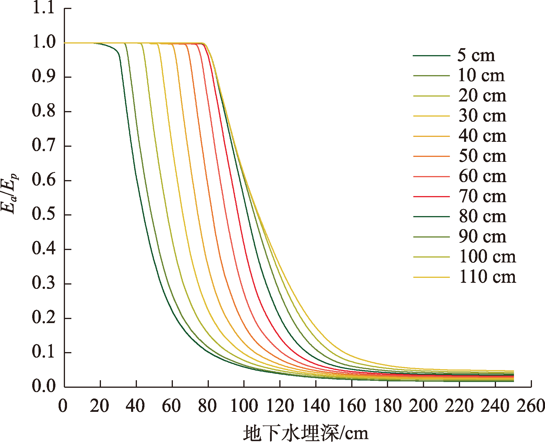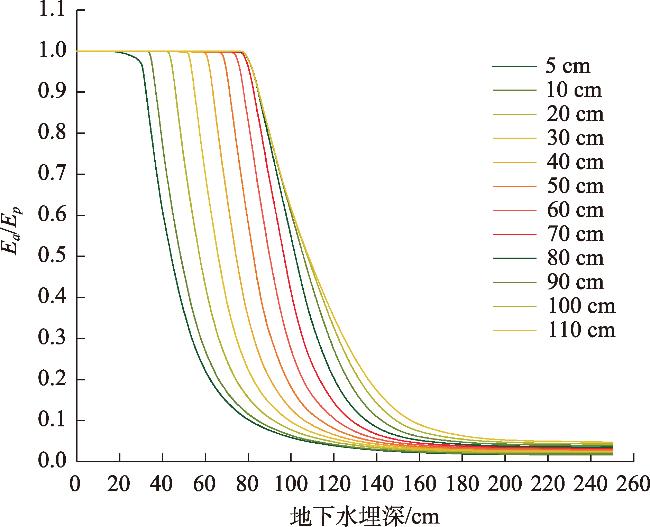 图14 夹壤层位置控制下实际蒸散(Ea)与潜在蒸发量(Ep)在不同地下水位深度下的比值Fig. 14 Variation of actual evaporation and stable evaporation depth with groundwater depth under the control of the soil layer position |