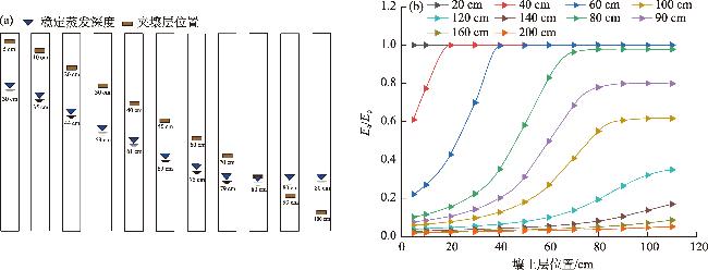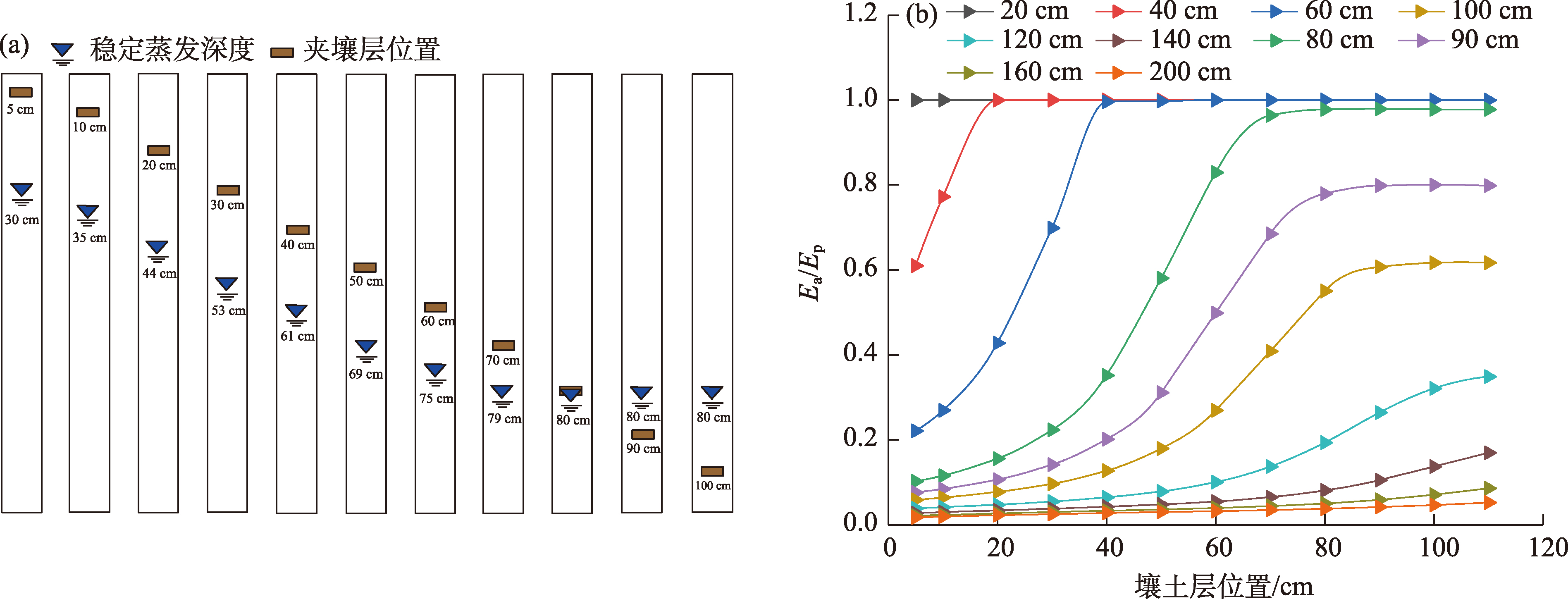 图15 稳定蒸发深度与夹壤层位置的关系(a),不同水位条件下夹壤层位置对实际蒸散(Ea)与潜在蒸发量(Ep)比值的影响(b)Fig. 15 Relationship between stable evaporation depth and the position of the interlayer (a), The influence of interlayer position on the ratio of actual evapotranspiration (Ea) to potential evaporation (Ep) under different water level conditions (b) |