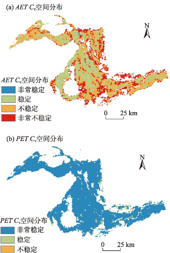 图6 阿克苏河流域AET和PET波动程度Fig. 6 Spatial distribution of fluctuation degrees of AET and PET in the Aksu River Basin |