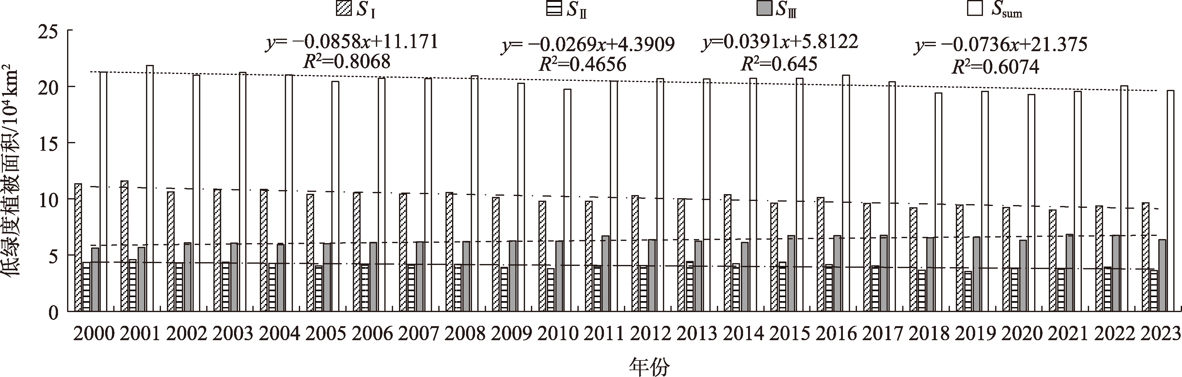 Exploring the quantitative pre assessment of the climate impact of vegetation greenness changes in the Qaidam Basin can help promote the integrated protection and systematic management of mountains, waters, forests, fields, lakes, grasses, sands, and gases. This article is based on MODIS NDVI data, meteorological data, and climate change prediction datasets. It monitors the changes in vegetation greenness with NDVI ≤ 0.3 in the Qaidam Basin from 2000 to 2023, analyzes the climate driving factors of vegetation with different greenness, and predicts the future trends of vegetation changes with different greenness. The results showed that in the past 24 years, vegetation types Ⅰ, Ⅱ, and Ⅲ in the Qaidam Basin accounted for 49.33%, 19.81%, and 30.86% of low green vegetation, respectively. Among them, the vegetation areas of Ssum, SⅠ, and SⅡ decreased significantly (P<0.001), while the vegetation area of SⅢ increased significantly, indicating a clear improvement in vegetation quality; The cumulative effect of water and heat conditions on precipitation of low green vegetation for 2-3 years and temperature for 5 years is significantly (P<0.01) greater than that of the current year, indicating that a warm and humid climate promotes the healthy development of grasslands; Under the three emission scenarios of RCP2.6, RCP4.5, and RCP8.5 in the future, the overall trend of low green vegetation in the Qaidam Basin is decreasing, and future climate conditions are favorable for vegetation restoration and expansion. The research results can provide scientific basis for the development of ecological environment protection and desertification control measures in the Qaidam Basin.