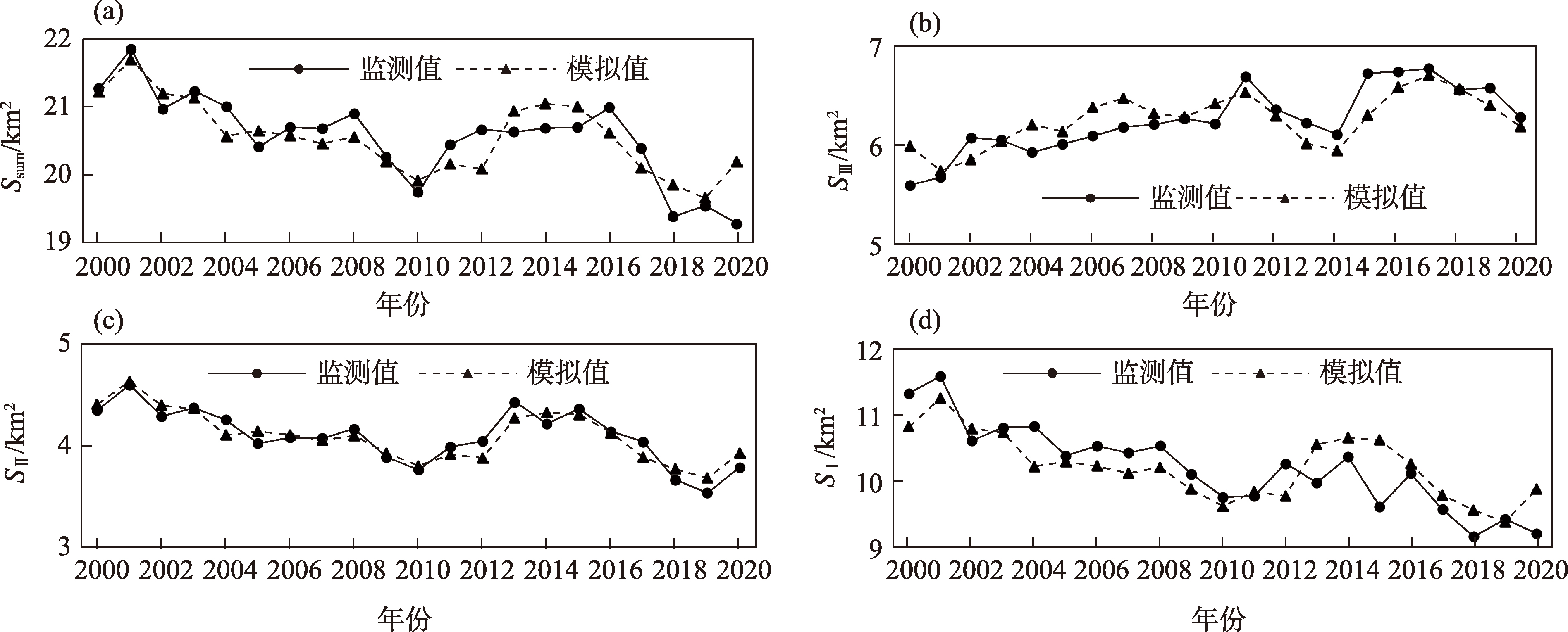 时段 | SⅠ植被面积与1986—2005年基准值比 | SⅠ植被面积与2000—2020年实测值比 | ||||