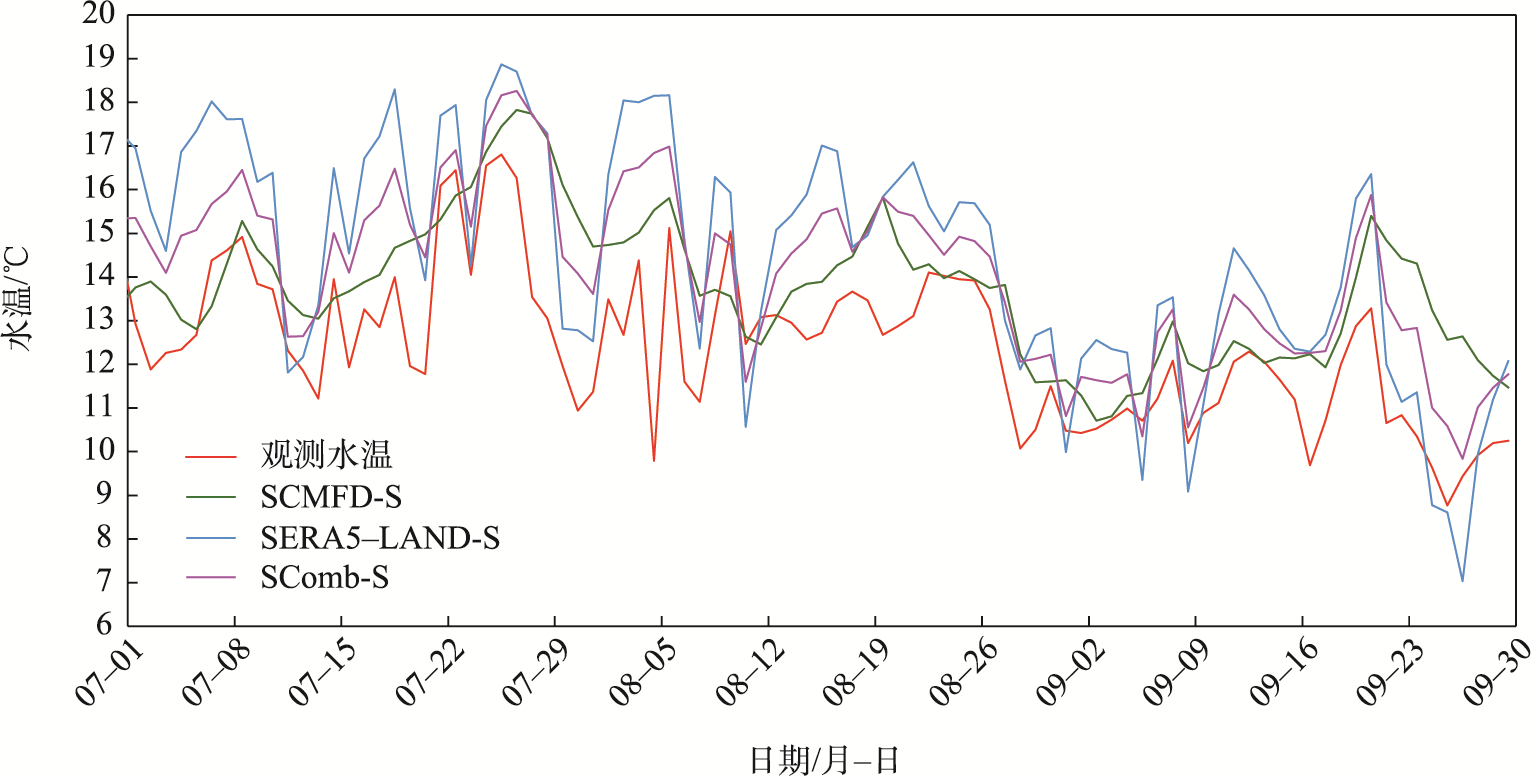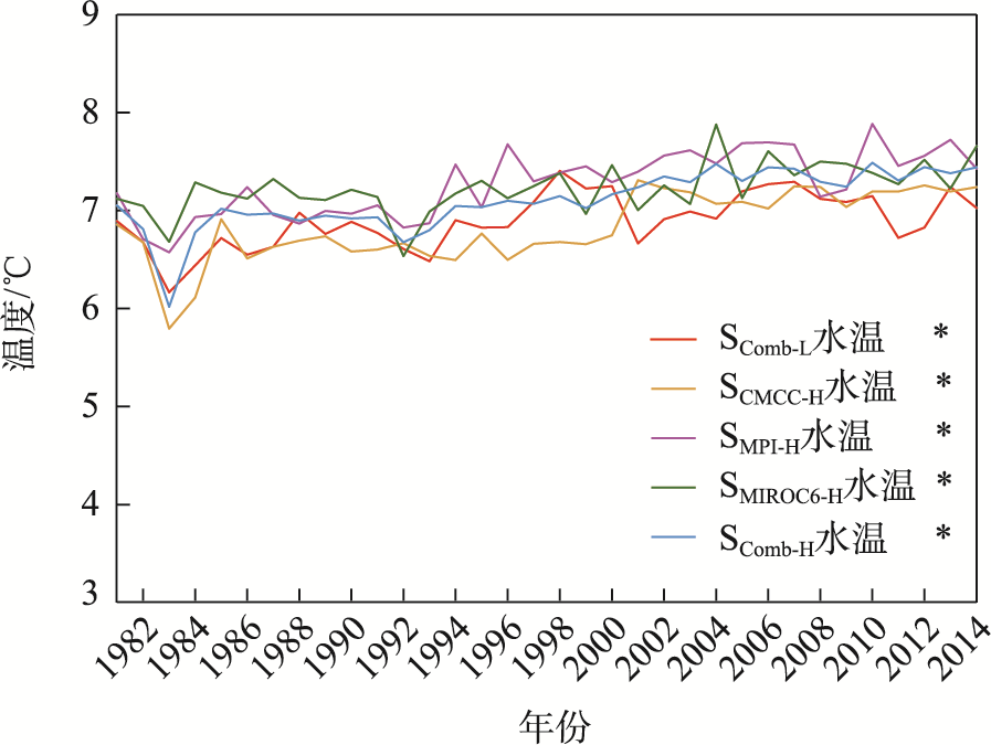 图3 1981—2014年CMFD和ERA5-Land模拟水温的集合与CMIP6三个模式的模拟水温及模拟水温的集合注:SComb-L、SCMCC-H、SMIROC6-H、SMPI-H、SComb-H分别为长时间序列CMFD和ERA5-Land模拟水温的集合、历史时期CMIP6三个模式的模拟水温及模拟水温的集合。 Fig. 3 The average simulated water temperature of CMFD and ERA5-Land, the single simulated water temperature of three models of CMIP6 and the average simulated water temperature of three models from 1981 to 2014 |