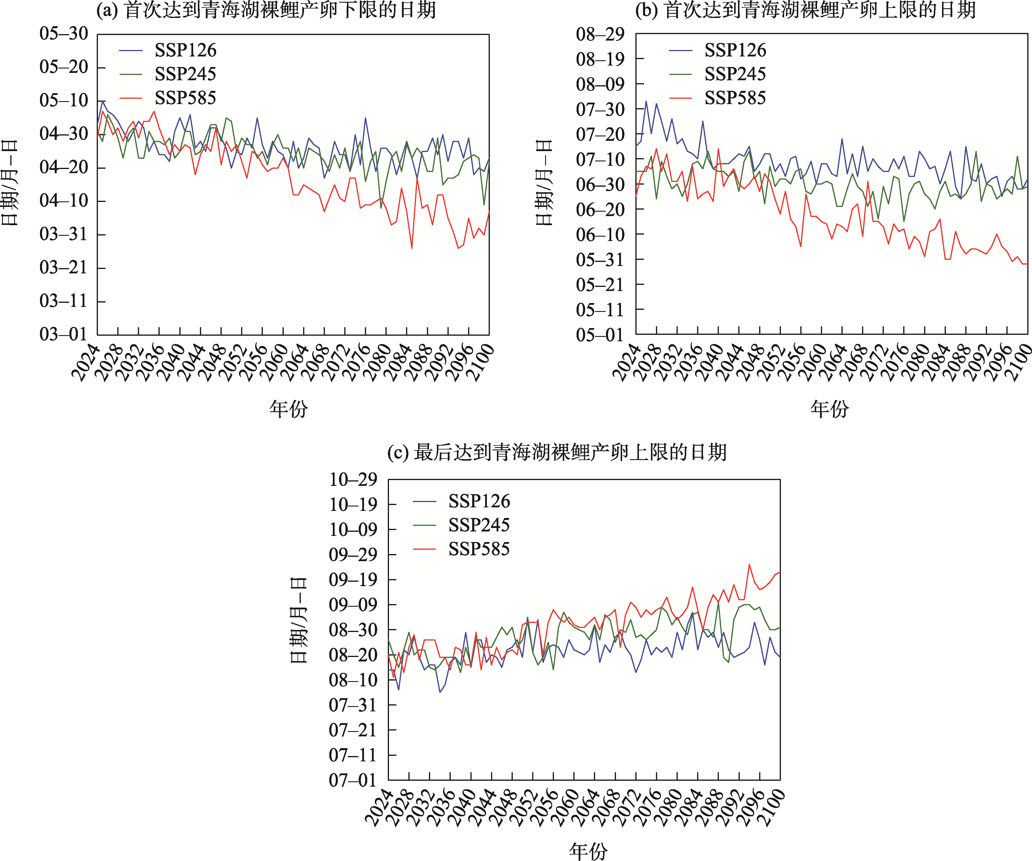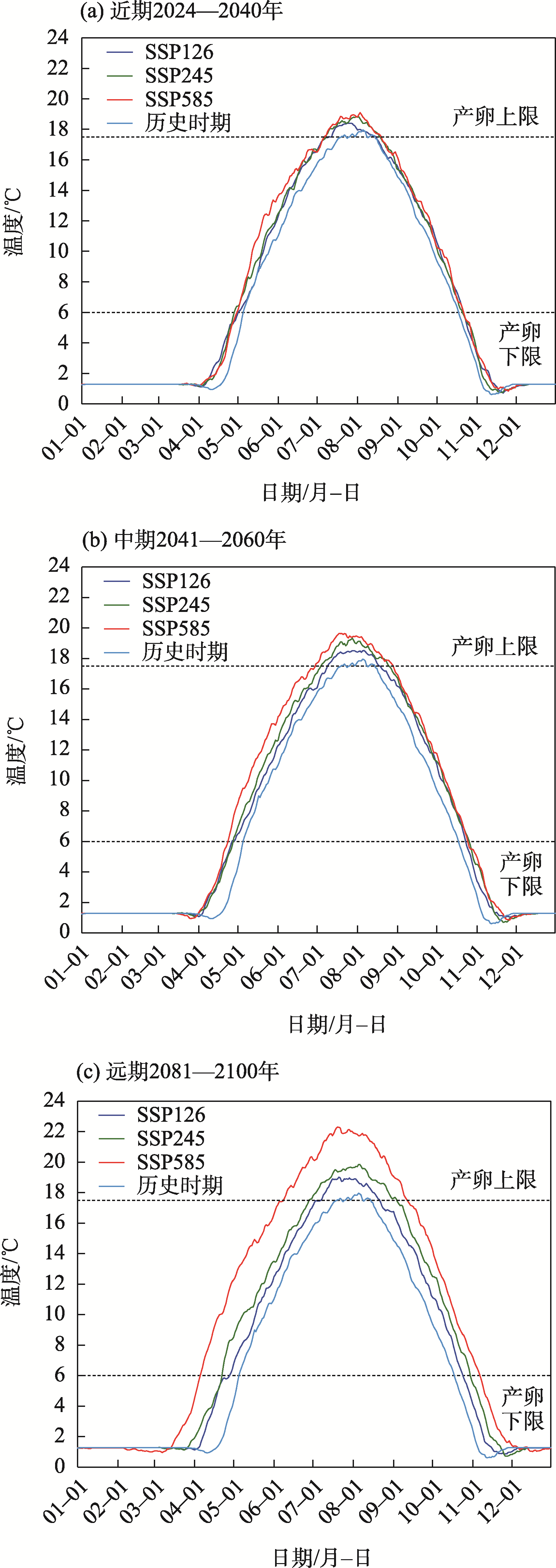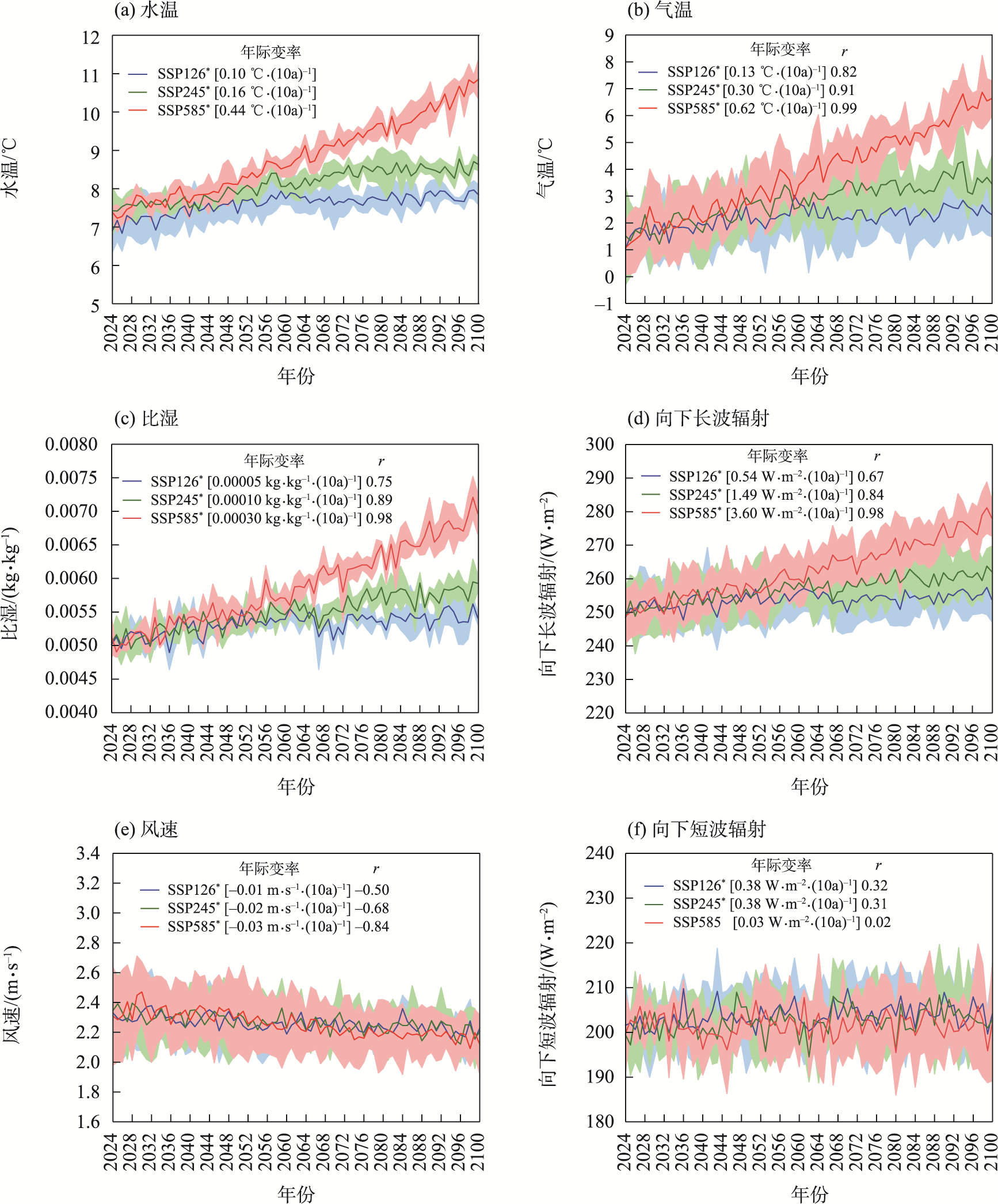 受全球气候变暖的影响,青藏高原湖泊、河流的温度显著升高,水温变化与水生生物的繁育息息相关,但目前对于青海湖裸鲤洄游产卵的重要场所——河流入湖口的水温研究较少,水温变化对于裸鲤产卵的影响也尚不明确。因此本研究基于刚察气象站观测数据、中国区域地面气象要素驱动数据集(CMFD)、欧洲中期天气预报中心第五代陆面再分析数据集(ERA5-Land)、第六次国际耦合模式比较计划(CMIP6)的多模式数据,尝试利用Fresh water Lake Model(简称FLake模式)模拟青海湖最大支流布哈河入湖口处水温并评估其适用性,探讨了再分析数据和CMIP6多模式数据驱动模拟历史(1981—2014年)水温的集合的优越性,预估了未来时期(2024—2100年)三种情景下的水温演变及成因,结果表明:(1) CMFD和ERA5-Land模拟水温的集合优于单个模式的模拟水温且在短期和长期模拟结果精度都较好,CMIP6多模式长期的模拟水温集合优于单个模式的模拟水温,可以较好的再现再分析数据模拟水温的集合。(2) 未来布哈河入湖口的水温随着排放强度的增加显著升高,与水温呈正相关的气象因子从大到小依次为气温、比湿、向下长波辐射和向下短波辐射,呈负相关的气象因子是风速;除远期高排放情景(SSP585)的向下短波辐射,其他情景的气象因子与水温的关系均通过了95%的显著性检验。(3) 近期(2024—2040年),三种情景的水温较历史时期均有少许升高,水温间的差异不大,青海湖裸鲤产卵的窗口期略微缩短,水温升高会对裸鲤的产卵造成轻微影响;中期(2041—2060年),三种情景的水温进一步升高,水温间的差异逐渐显现,裸鲤的产卵窗口期明显缩短,水温升高对裸鲤的产卵有一定的危害;远期(2081—2100年),三种情景的水温差异更显著,SSP126和SSP245情景的升高速率减慢;SSP585情景的水温升高速率依旧加快,水温持续升高导致裸鲤的产卵窗口期显著缩短,一定程度限制了青海湖裸鲤的产卵活动。