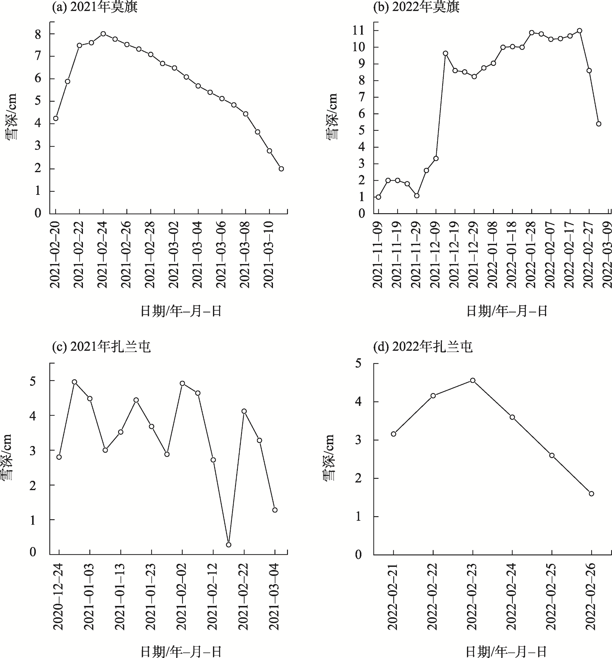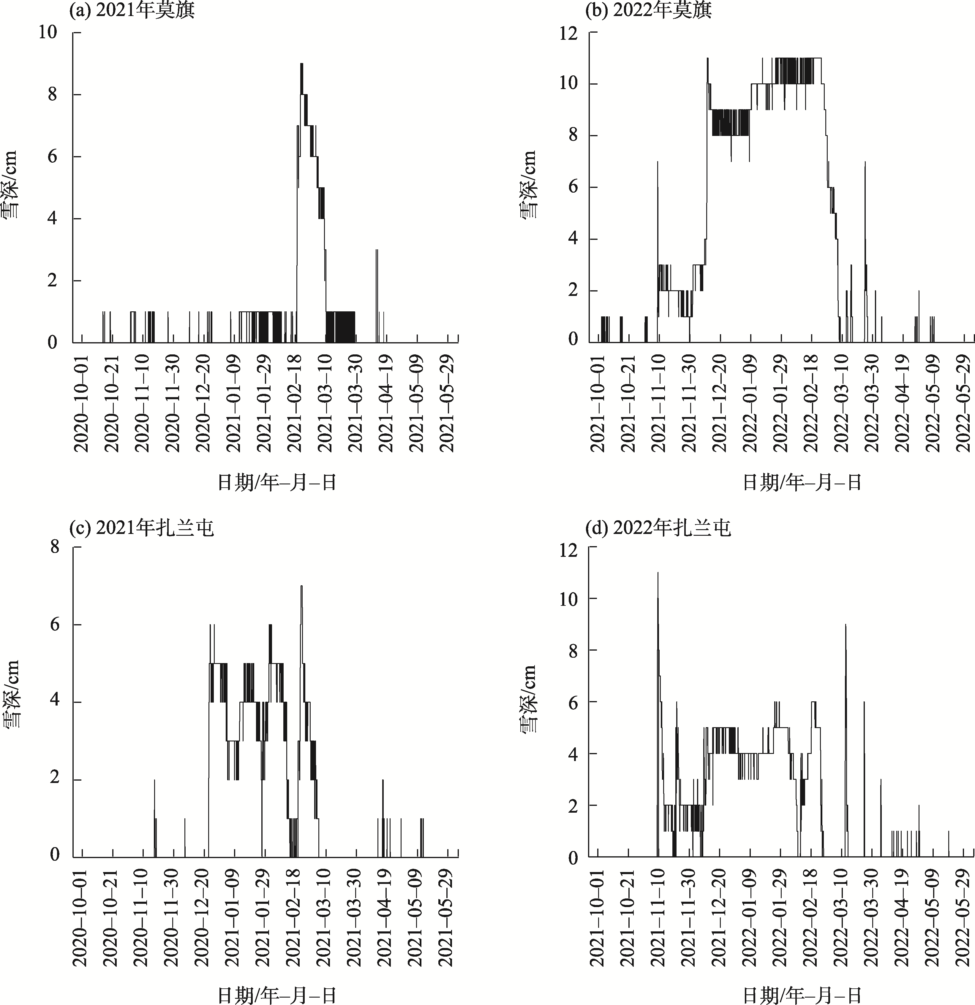 春季融雪过程不仅是陆面过程与冰雪水文研究领域的关键一环,更直接指示了气候、物候及其变化特征。受气候条件以及观测数据的限制,呼伦贝尔中高纬农田地区积雪消融过程及其变化规律长期被忽略。本文以呼伦贝尔东部农田区域两个野外雪深自动观测站2021—2022年小时级雪深数据以及同步气温、地表温度等气象观测数据为依据,分析了呼伦贝尔农区积雪消融过程及其敏感影响因子。结果表明:(1) 在呼伦贝尔高纬农区积雪持续期一般始于10月中旬并终于次年3月上旬,其中,2022年的积雪期长达116 d。秋冬季节积雪较浅,雪深一般处于5~9 cm,春季雪深大多超过10 cm以上。积雪融化期始于3月上旬,完全融化需5~18 d。(2) 年融雪过程表现为先逐渐减少后迅速融化的前稳后急特征。日融雪过程则开始于每日9:00—10:00,最大融雪速率通常出现于11:00—16:00。(3) 气温和雪面温度对积雪融化影响显著,但融雪与土壤温度相关最为显著,9:00—17:00地
