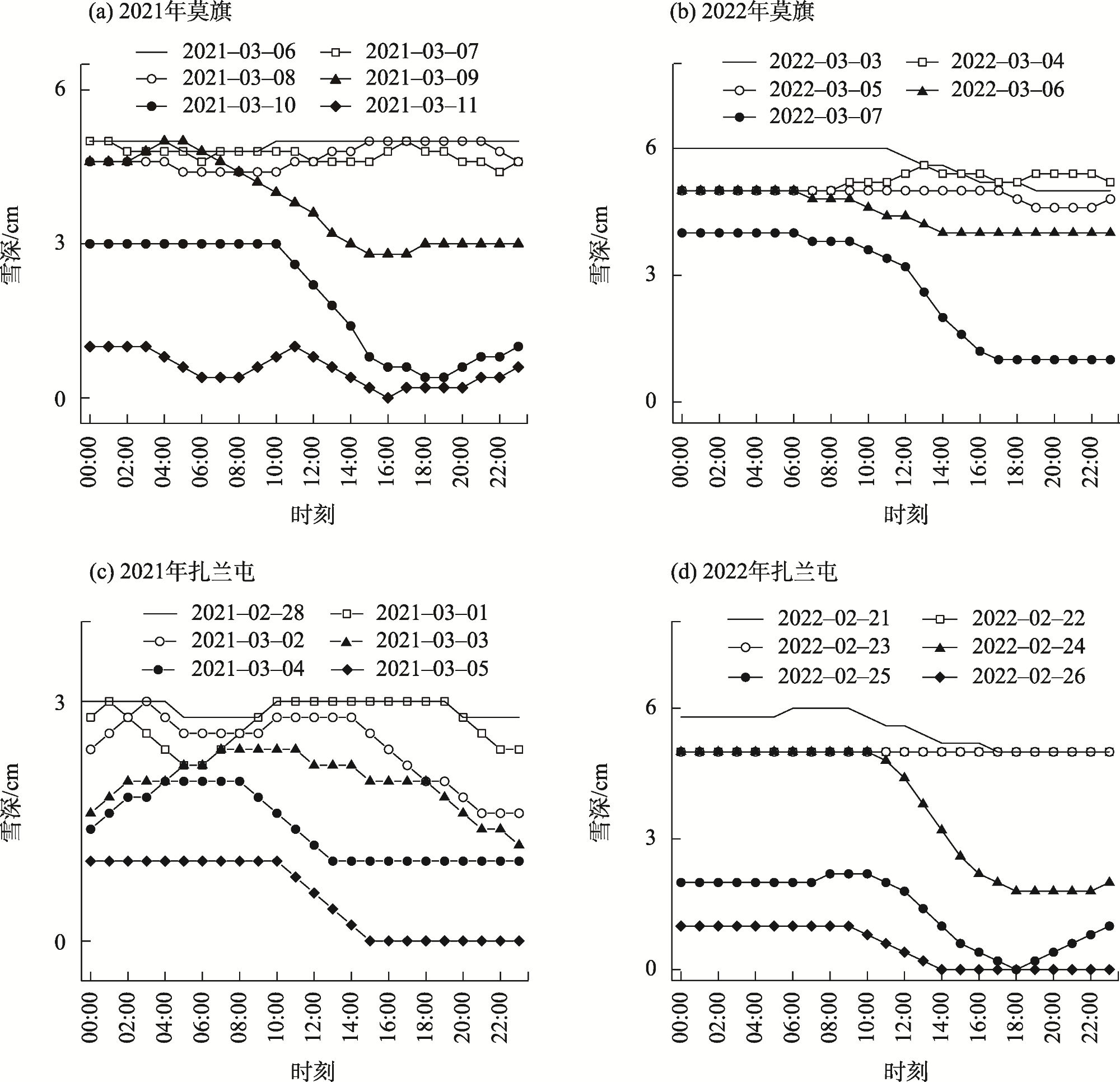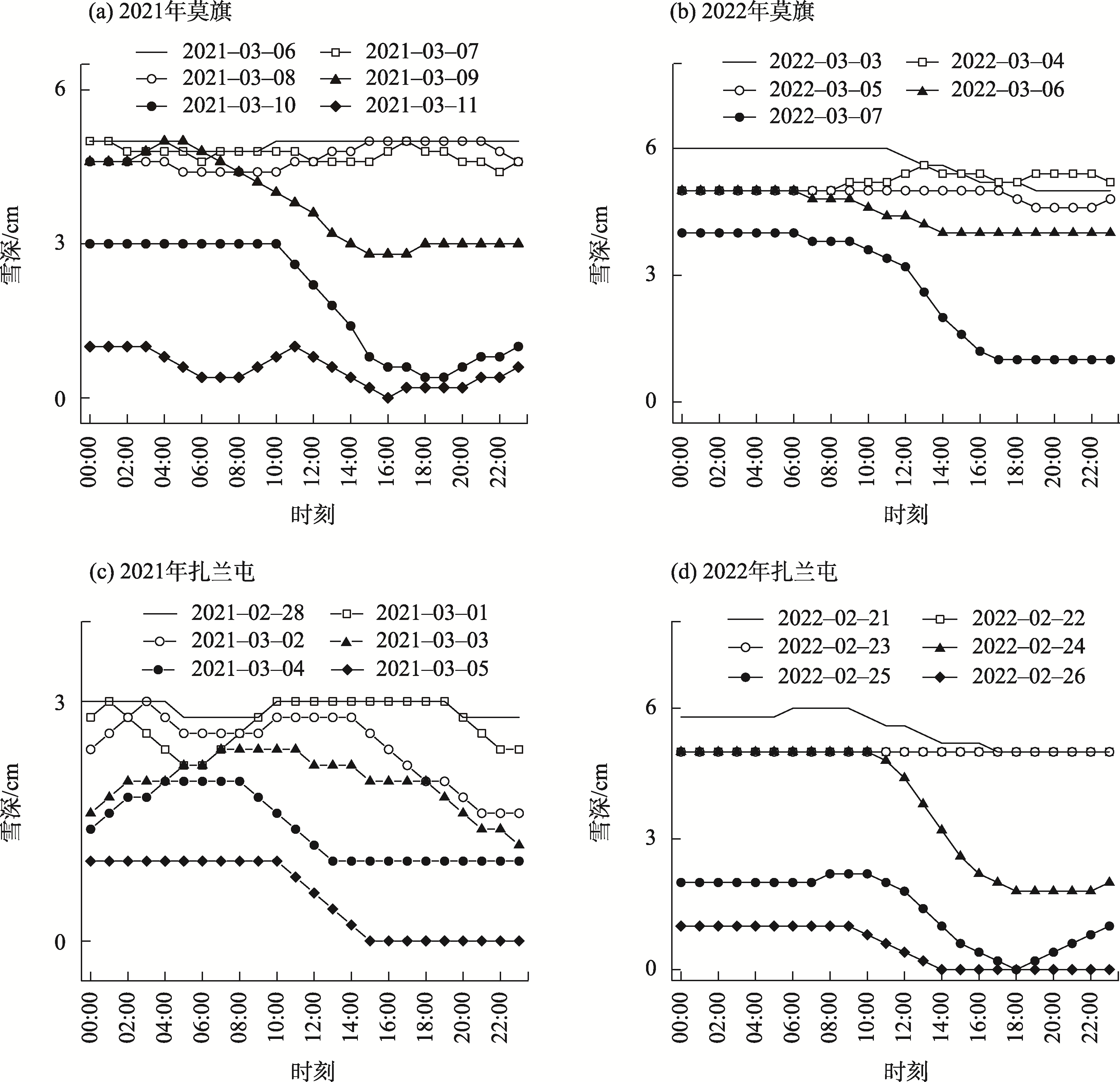 表1 莫旗、扎兰屯站点融雪期逐1 h雪深与同步至超前6:00气温相关系数Tab. 1 Correlation coefficients between 1-hour snow depth during the snowmelt period at Moqi and Zhalantun stations and temperature synced to 6:00 ahead |