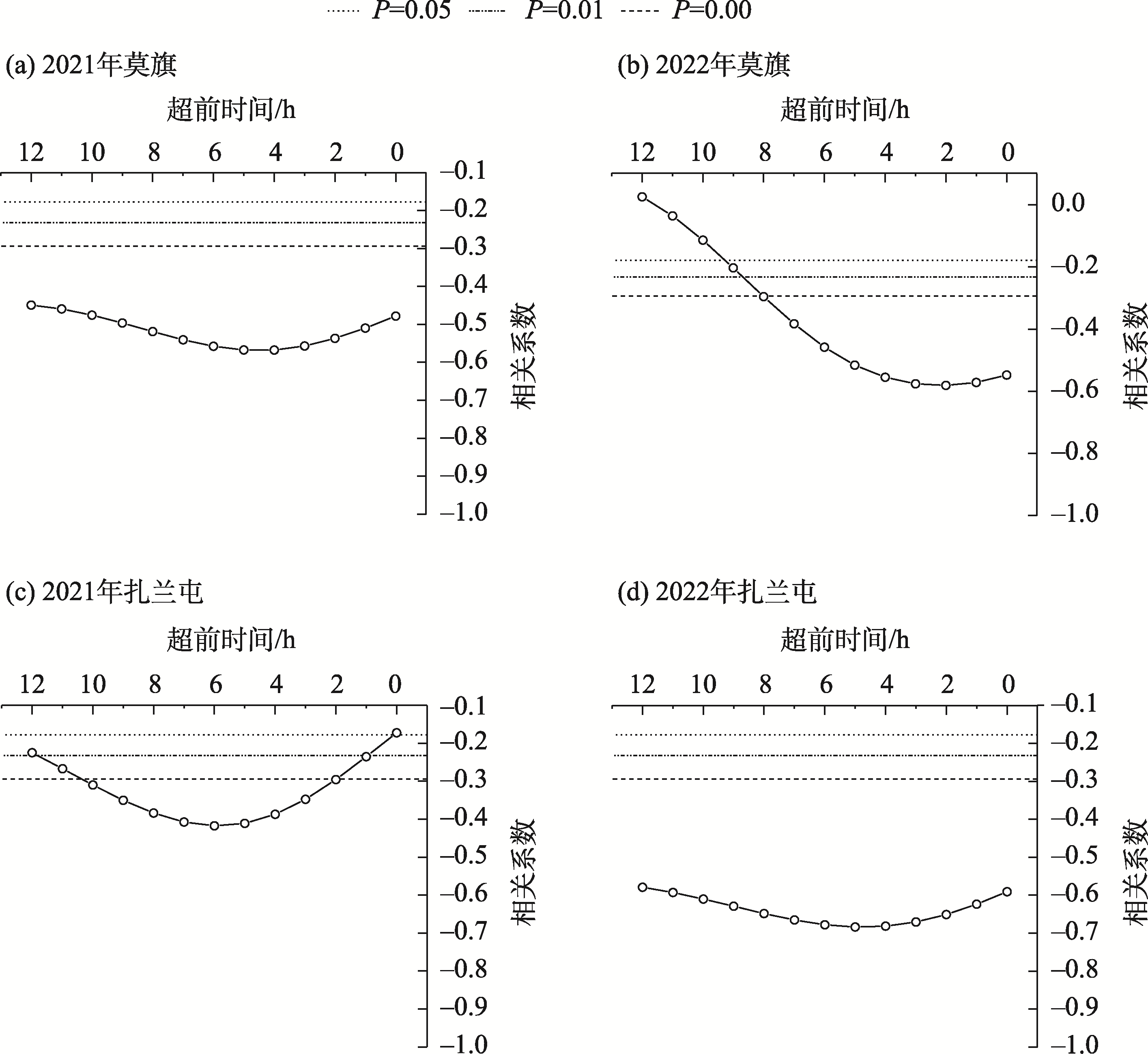 表2 2021年莫旗和2022年扎兰屯站点快速融雪期20:00雪深与超前12 h不同气象因子间相关系数Tab. 2 Correlation coefficients between 20:00 snow depth during the rapid snowmelt period at Moqi in 2021 and Zhalantun in 2022 and different meteorological factors 12 hours ahead |