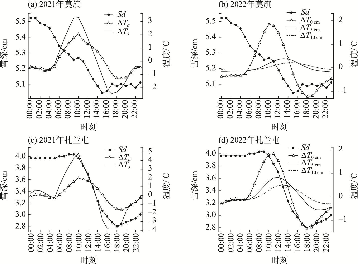 图5 多日平均不同时刻雪深与气温、雪面温度及0 cm、5 cm、10 cm地表温度的变化量注:Sd表示积雪深度;ΔTa表示气温变化量;ΔTs表示雪面温度变化量;ΔT0 cm表示0 cm地表温度变化量;ΔT5 cm表示5 cm地表温度变化量;ΔT10 cm表示10 cm地表温度变化量。 Fig. 5 Changes in multi-day average snow depth at different times and air temperature, snow surface temperature, and ground temperature at 0 cm, 5 cm and 10 cm |