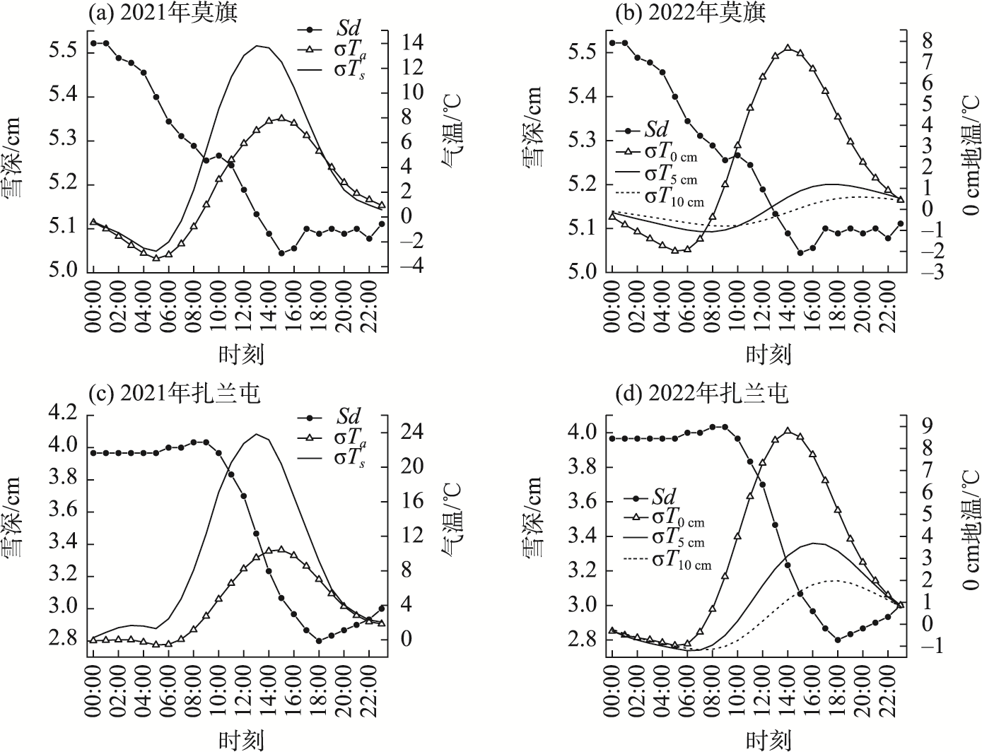 图6 多日平均不同时刻雪深与气温、雪面温度及0 cm、5 cm、10 cm地表温度的差值累积量注:Sd表示积雪深度;σTa表示气温变化累积量;σTs表示雪面温度变化累积量;σT0 cm表示0 cm地表温度变化累积量;σT5 cm表示5 cm地表温度变化累积量;σT10 cm表示10 cm地表温度变化累积量。 Fig. 6 Cumulative difference of multi-day average snow depth at different times and air temperature, snow surface temperature, and ground temperature at 0 cm, 5 cm and 10 cm |