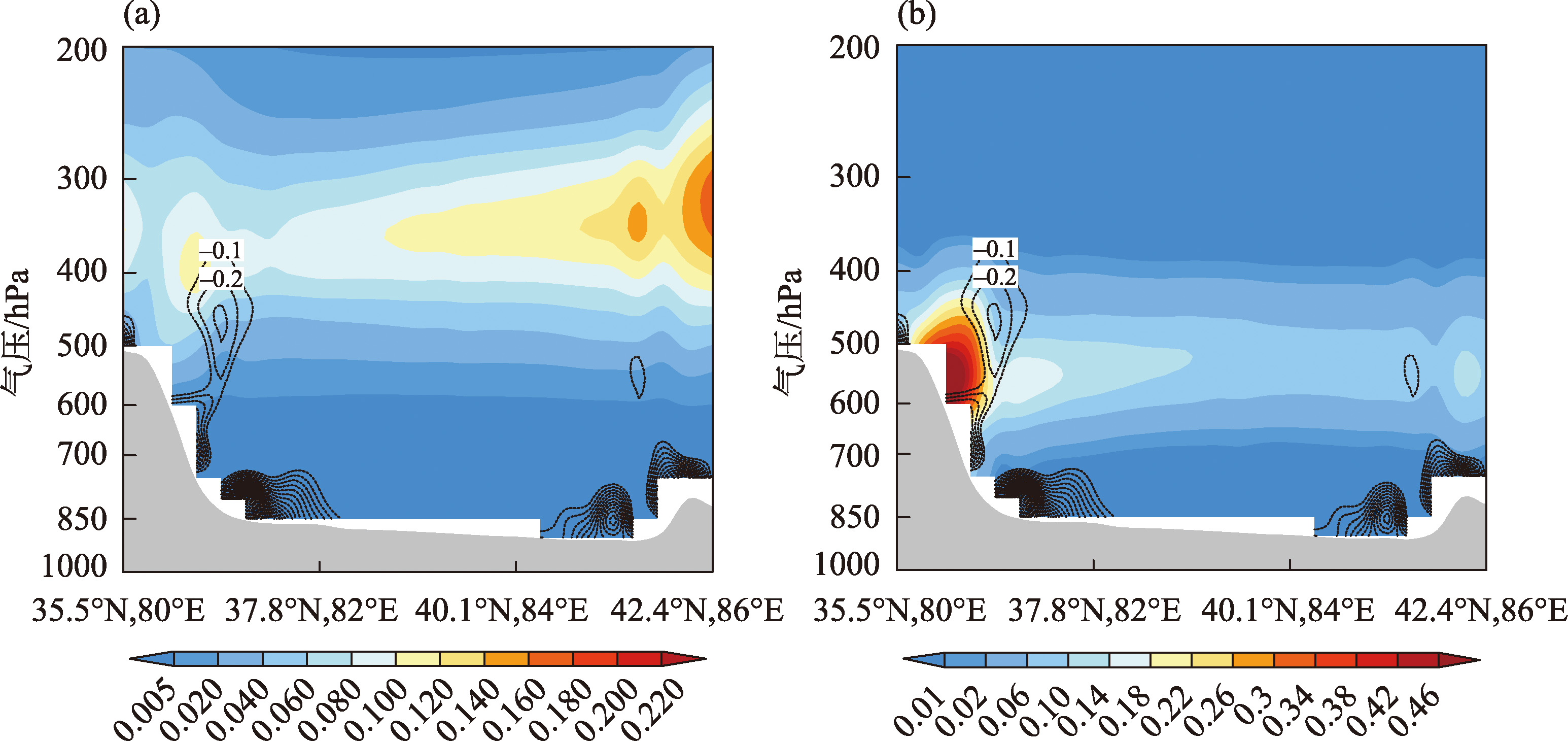 图7 1979—2022年夏季沿图1蓝色实线的云冰水含量(单位:10-1g·m-2)和水汽通量散度(单位:10-5 g·m-1·s-1)(a)、云液水含量(单位:10-1g·m-2)和水汽通量散度(单位:10-5 g·m-1·s-1)(b)垂直剖面图注:图中灰色阴影为地形高度。 Fig. 7 Vertical profiles of (a) cloud ice water content (unit: 10-1g·m-2) and water vapor flux divergence (unit: 10-5g·m-1·s-1), (b) cloud liquid water content (unit: 10-1g·m-2) and water vapor flux divergence (unit: 10-5g·m-1·s-1) along the blue solid line in Figure 1 in summer from 1979 to 2022 |