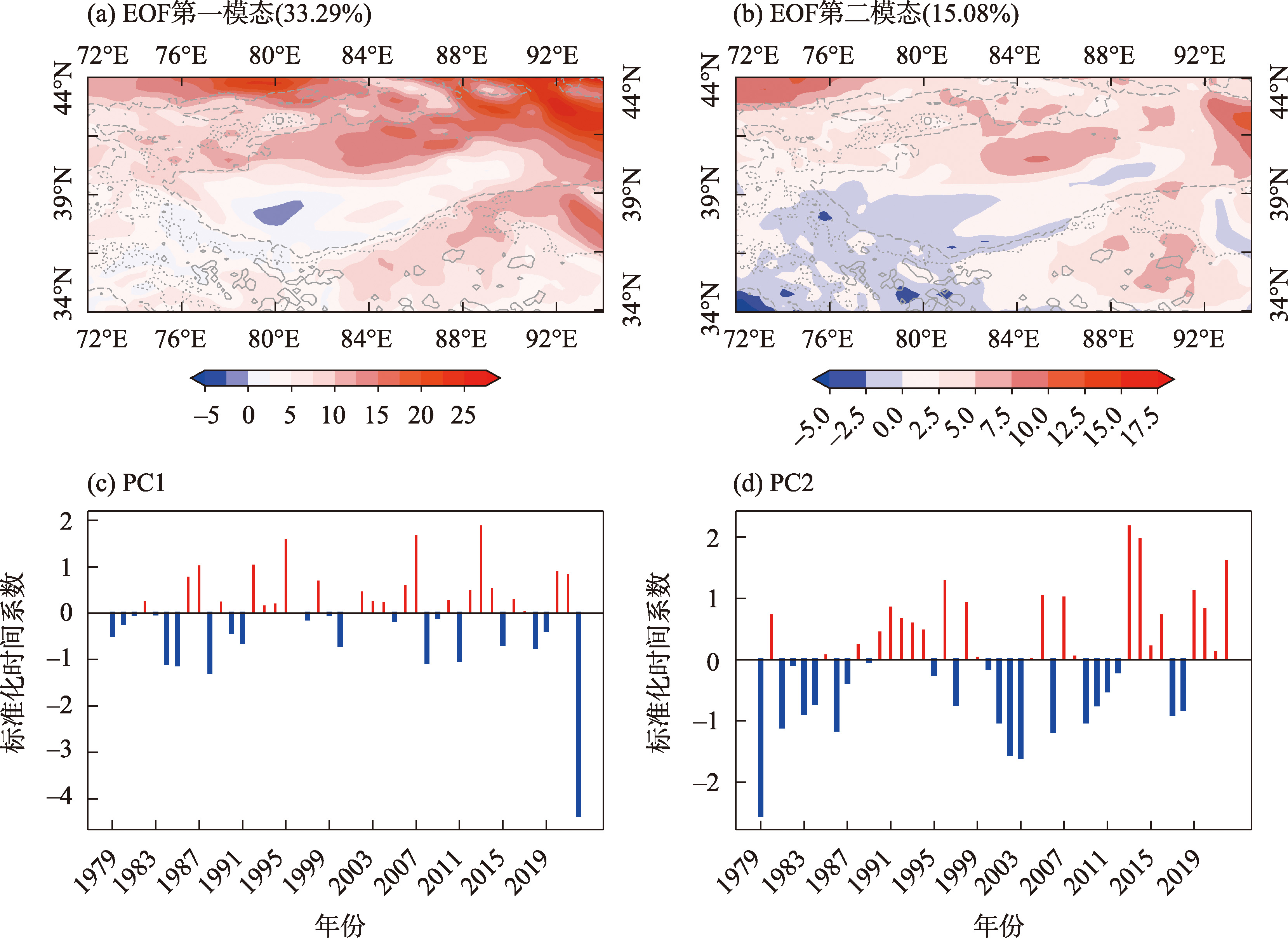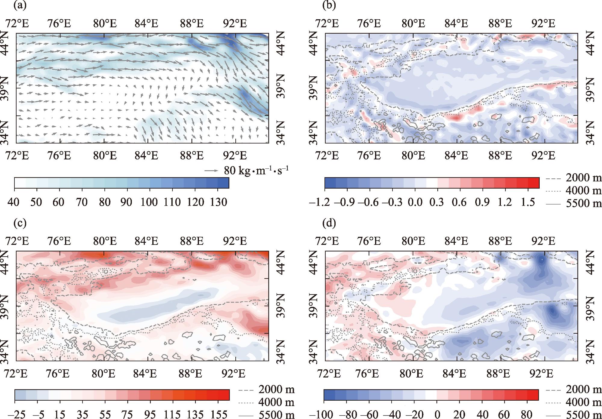 图3 1979—2022年塔里木盆地夏季平均整层水汽通量(a,矢量,单位:kg·m-1·s-1,阴影>40 kg·m-1·s-1)、水汽通量散度(b,单位:10-5 g·m-1·s-1)、整层纬向水汽通量(c,单位:kg·m-1·s-1)和整层经向水汽通量(d,单位:kg·m-1·s-1)分布Fig. 3 Distribution of the average water vapor flux (a, vector, unit: kg·m-1·s-1, shade >40 kg·m-1·s-1), water vapor flux divergence (b, unit: 10-5g·m-1·s-1), the zonal water vapor flux (c, unit: kg·m-1·s-1) and the meridional water vapor flux (d, unit: kg·m-1·s-1) in the whole layer in the Tarim Basin in summer from 1979 to 2022 |