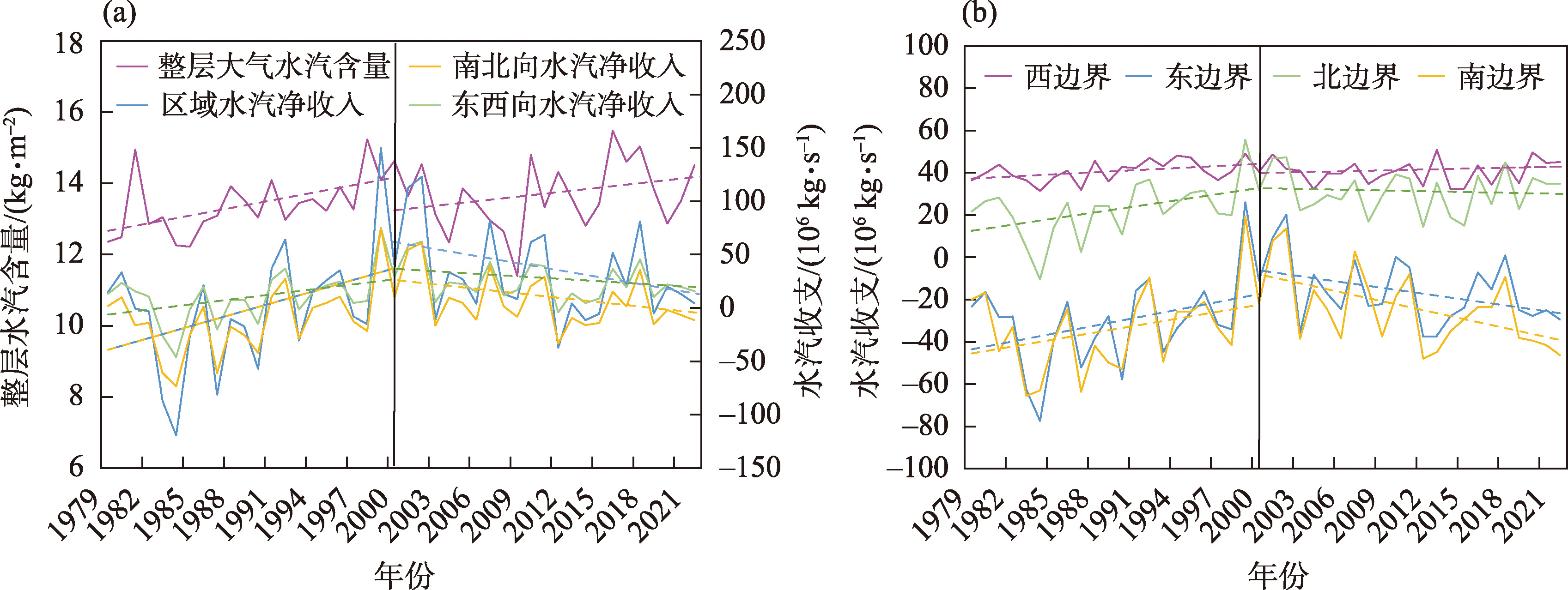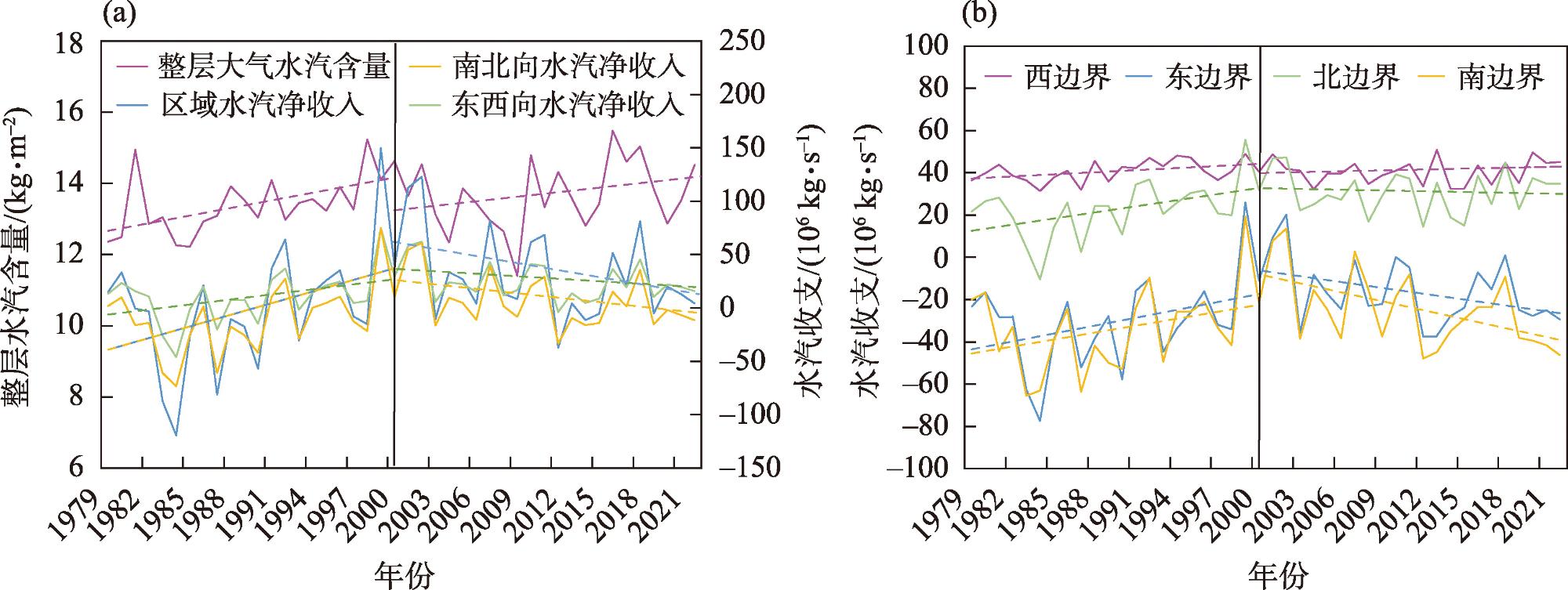 图9 1979—2022年塔里木盆地夏季区域平均整层大气水汽含量(单位:g·m-2)和区域水汽净收入(单位:106 kg·s-1)的时间演变(a)、区域不同边界水汽收支(单位:106 kg·s-1)的时间演变(b)Fig. 9 Temporal evolution of (a) the regional average atmospheric water vapor content (unit: g·m-2) and regional water vapor net income (unit: 106 kg·s-1), of (b) the water vapor budget (unit: 106 kg·s-1) from different boundaries of the Tarim Basin in the summer from 1979 to 2022 |