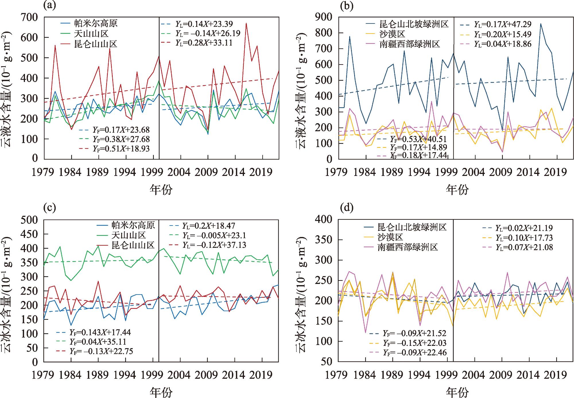 图10 1979—2022年塔里木盆地夏季高山(a、c)、绿洲和沙漠区(b、d)云液水含量和云冰水含量年际变化注:方程下标F和L分别代表1979—2000年和2001—2022年拟合的一元线性回归方程,方程系数×10为增长率。 Fig. 10 Interannual variation of cloud liquid water content and cloud ice water content in alpine (a, c), oases and deserts (b, d) in the Tarim Basin in summer from 1979 to 2022 |