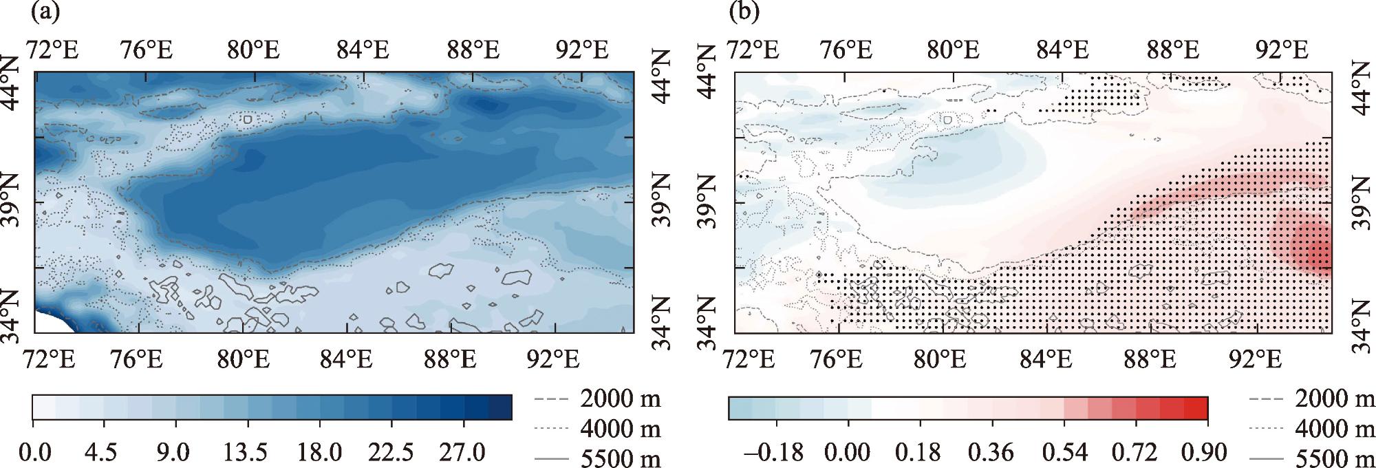 图2 1979—2022年塔里木盆地夏季平均整层大气水汽含量(a,阴影,单位:kg·m-2)及其变化趋势(b,阴影,单位:kg·m-2·(10a)-1)分布注:(b)中黑色点代表通过显著性检验P>0.05的区域。 Fig. 2 The distribution of the average atmospheric water vapor content (shade, unit: kg·m-2) and its change trend [shade, unit: kg·m-2·(10a)-1] in the Tarim Basin in summer from 1979 to 2022 |