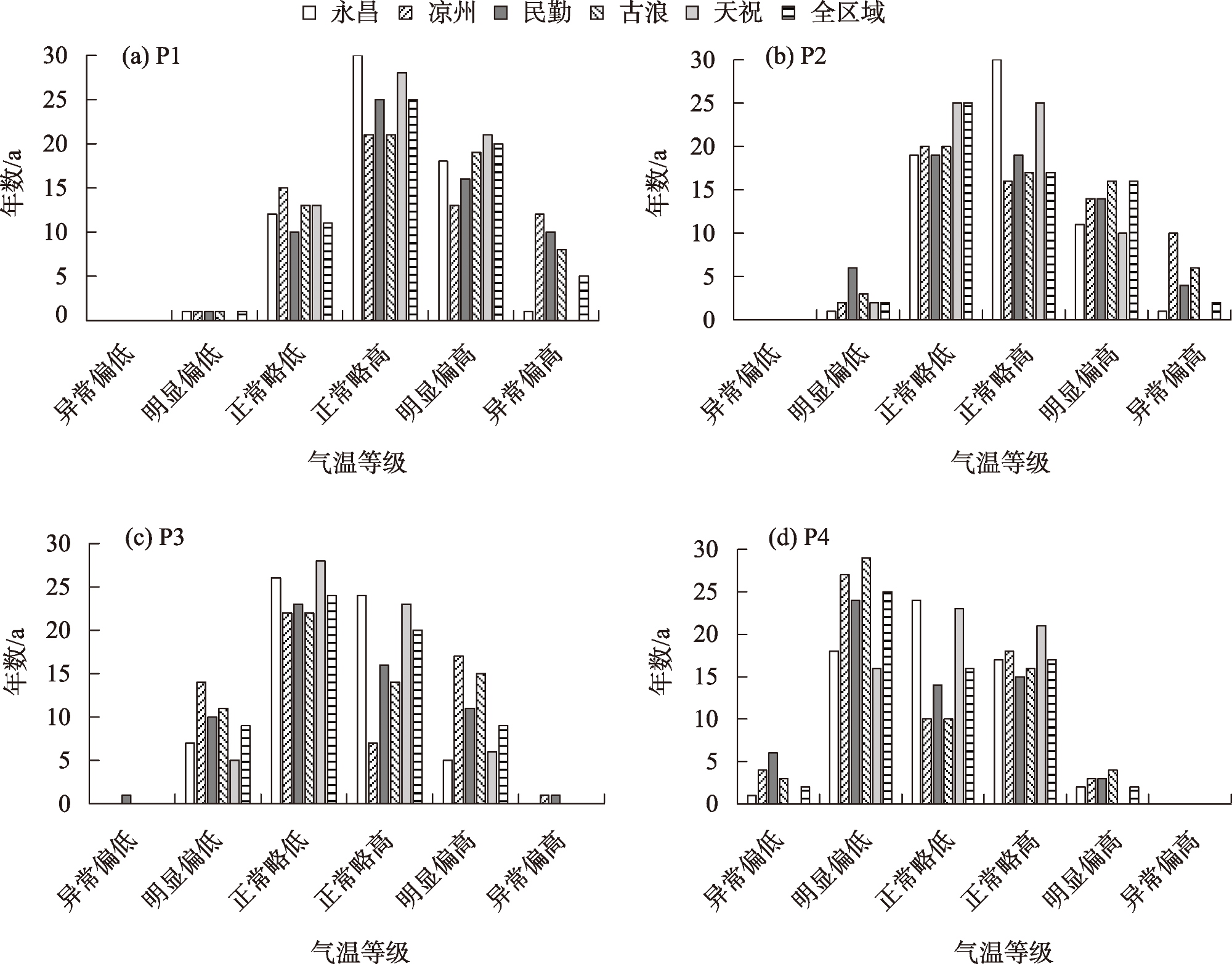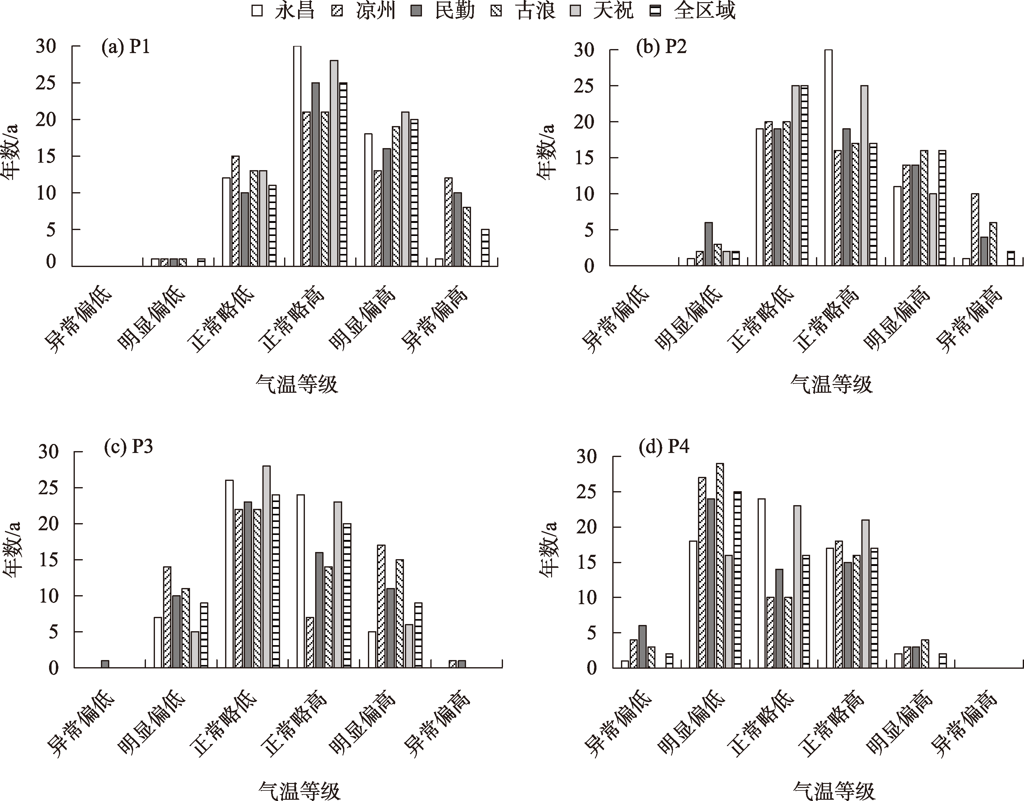 图4 河西走廊东部4个气候态年平均气温等级评价年数变化Fig. 4 Years change of annual average temperature grade evaluation of four climate states in Hexi Corridor Eastern |