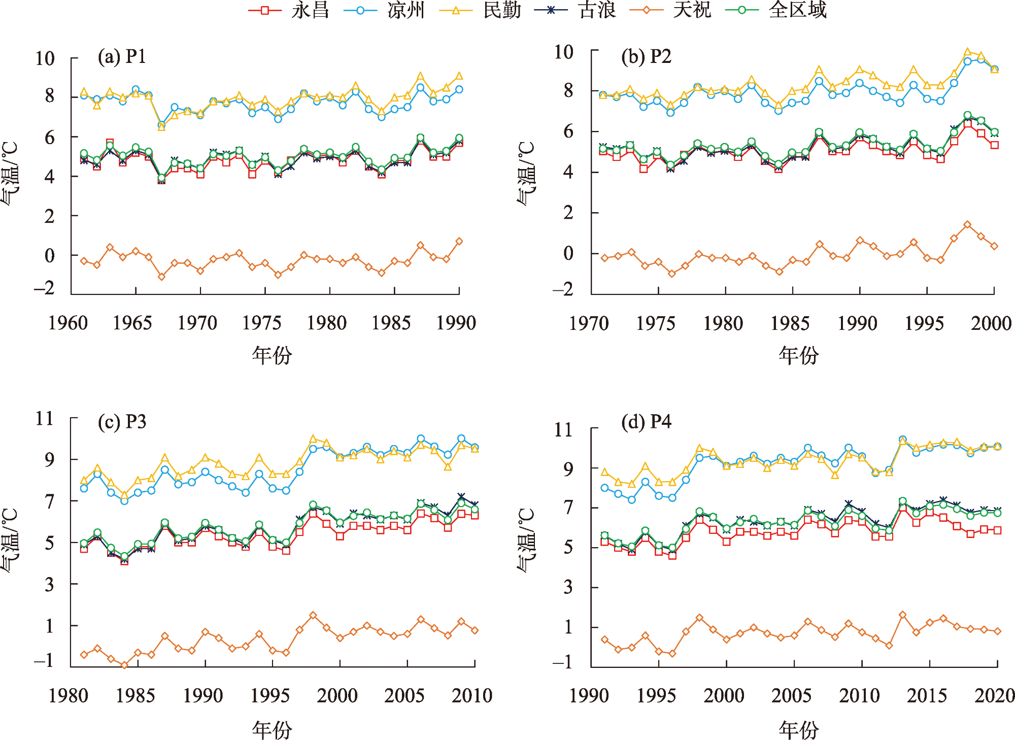 表2 河西走廊东部4个气候态年平均气温的均值、气候倾向率、趋势系数及气候倾向率的差Tab. 2 Mean value and climate tendency rate and trend coefficient and difference of climate tendency of annual average temperature of four climatic states in Hexi Corridor Eastern |