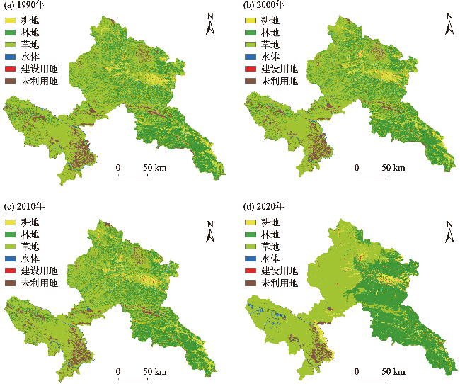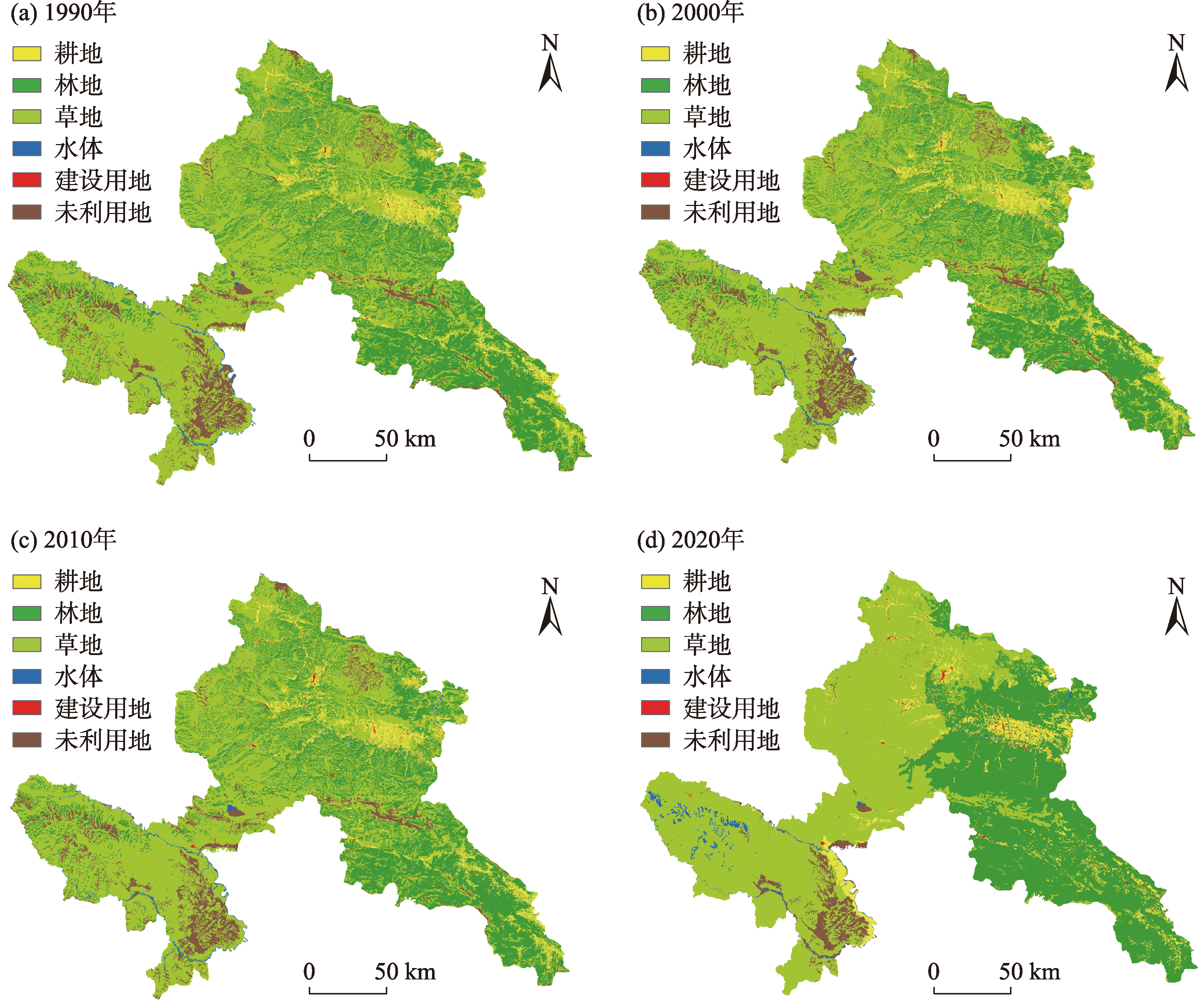 图2 1990年、2000年、2010年和2020年土地利用空间分布Fig. 2 Spatial distribution of land use in 1990, 2000, 2010 and 2020 |