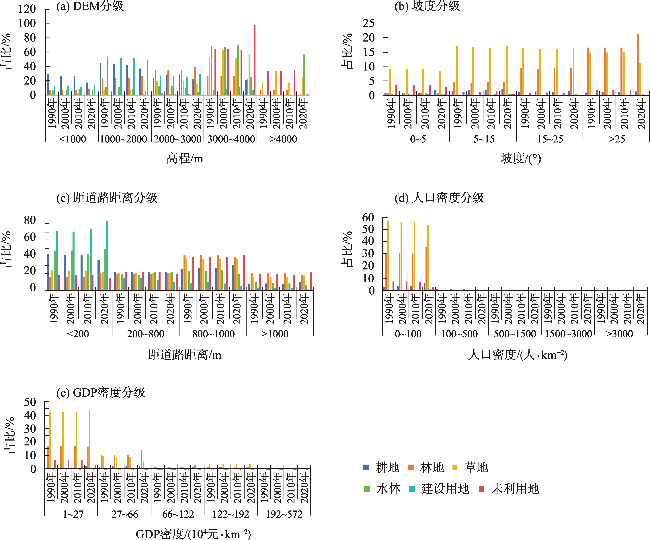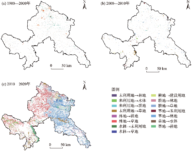 表2 甘南藏族自治州土地利用变化动态度、贡献率与强度Tab. 2 Dynamic attitude, contribution rate and intensity of land use change in Gannan Tibetan Autonomous Prefecture |