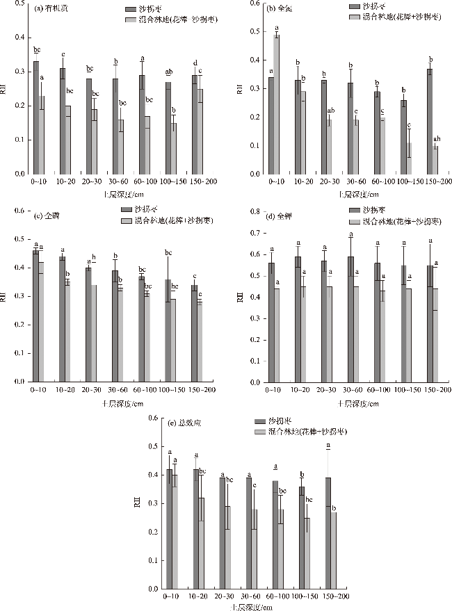 表3 混合群落(花棒+沙拐枣)土壤养分恢复指数Tab. 3 Soil nutrient recovery index of mixed forest land (flower stick+sand turn jujube) |