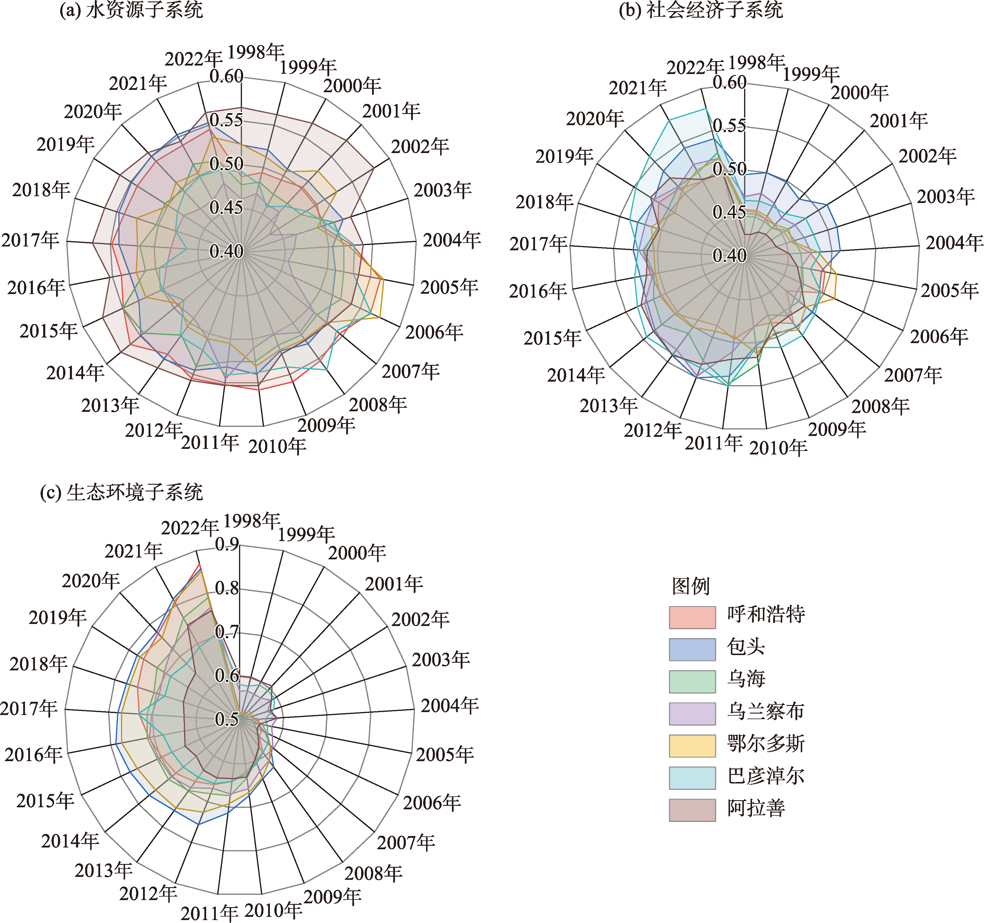 表1 黄河流域内蒙古段水资源-社会经济-生态环境系统指标体系Tab. 1 Water resources-socioeconomic-ecological environment system indicator system of the Inner Mongolia section in the Yellow River Basin |