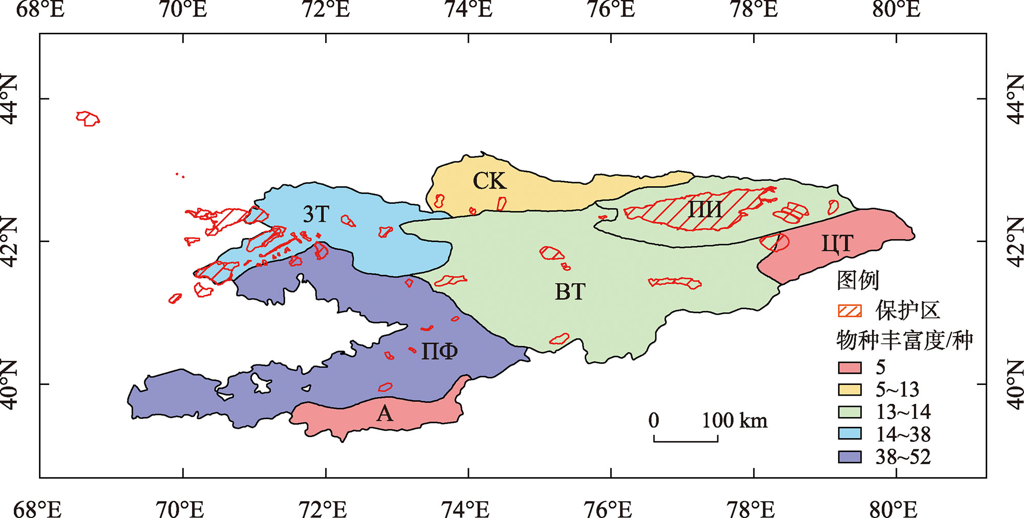 为了解吉尔吉斯斯坦受威胁维管植物资源现状,本文以《吉尔吉斯斯坦红皮书(2006版)》为基础,结合世界自然保护联盟(IUCN)收录的吉尔吉斯斯坦维管植物红色名录,确定了吉尔吉斯斯坦受威胁维管植物名录。根据植物志等文献资料统计分析其科属组成、受威胁等级、生活型、植物资源多样性,运用ArcGIS软件结合现有保护区数据研究其物种丰富度的地理分布格局。结果表明:吉尔吉斯斯坦受威胁植物有27科61属86种(含种下等级,下同),被子植物占绝对优势(98.36%),受威胁植物物种数前五科分别为百合科(Liliaceae,17种)、蔷薇科(Rosaceae,9种)、菊科(Asteraceae,9种)、伞形科(Apiaceae,9种)和唇形科(Lamiaceae,6种);从受威胁等级来看,极危种(CR)12种、濒危种(EN)22种、易危种(VU)52种,人类活动是最主要的威胁因素。生活型划分为多年生草本64种、乔木9种、灌木7种、半灌木6种、一年生草本和藤本均为1种。受威胁植物在植物地理区尺度上分布不均匀,集中分布在吉尔吉斯斯坦的西部和西南部,且物种丰富度高的植物地理区覆盖的保护区面积却较小。
