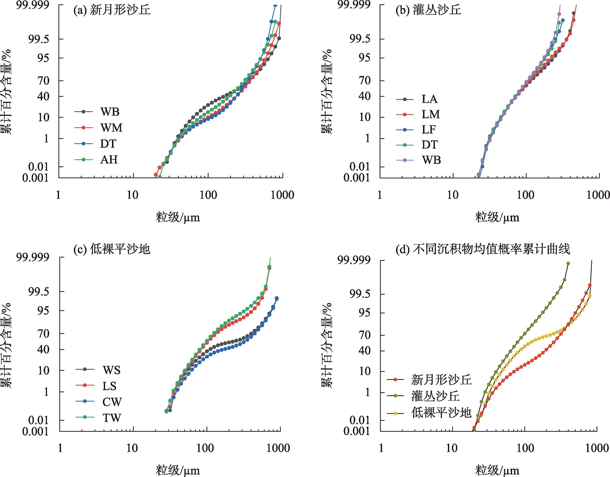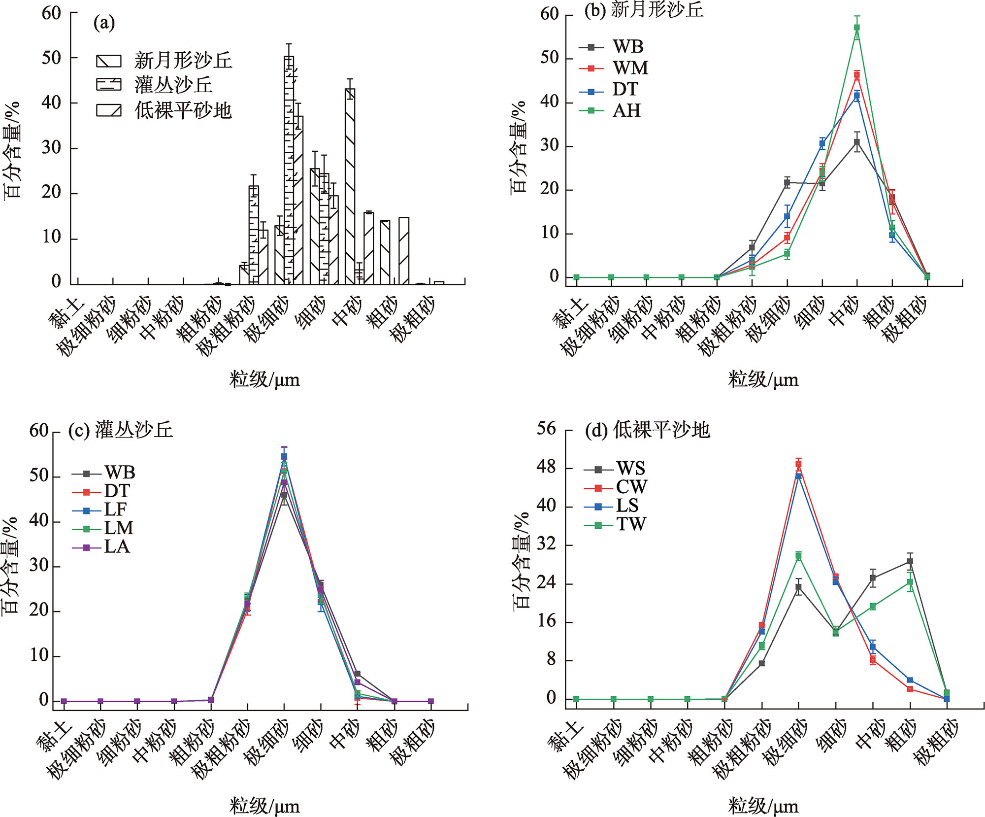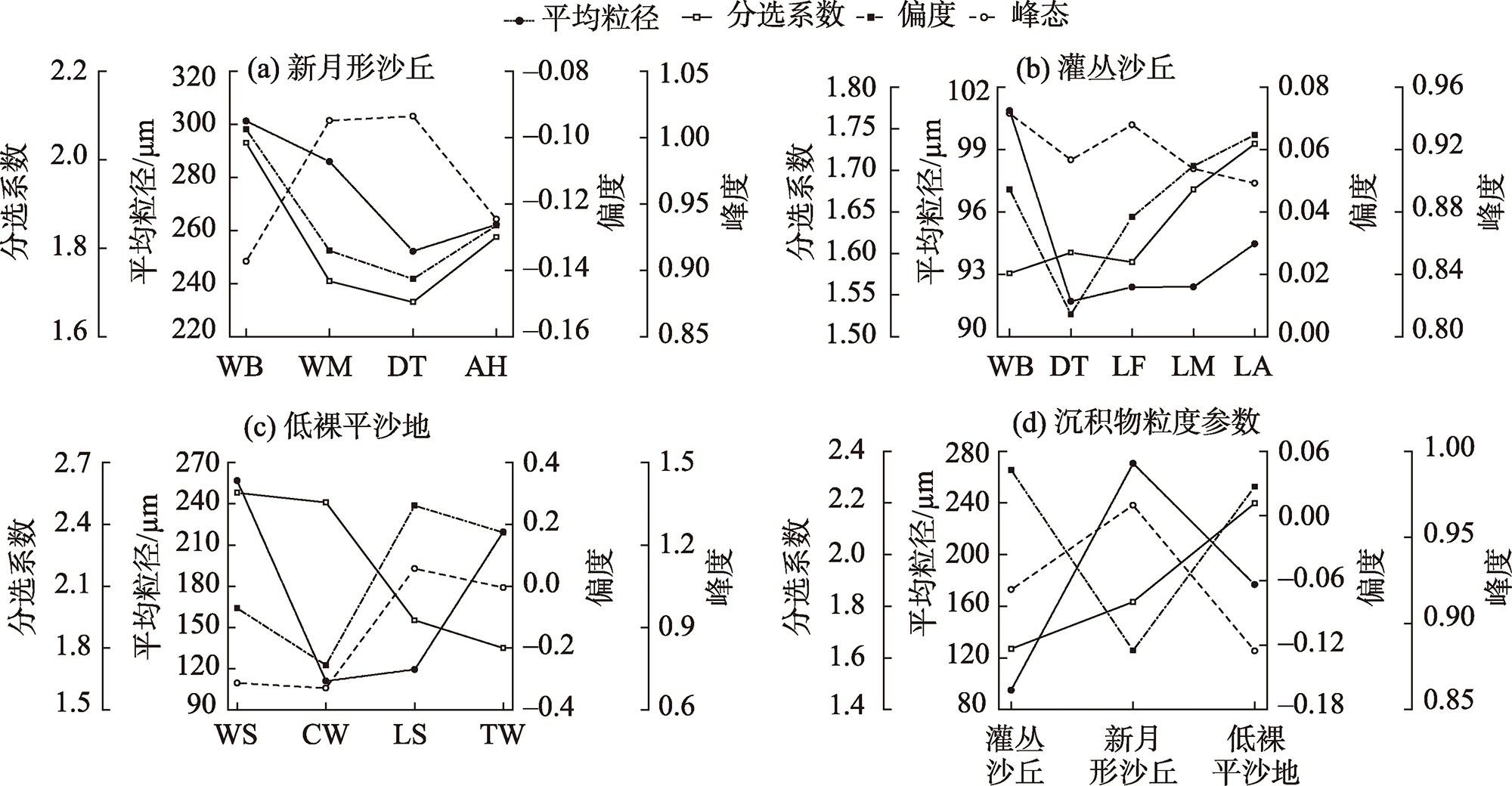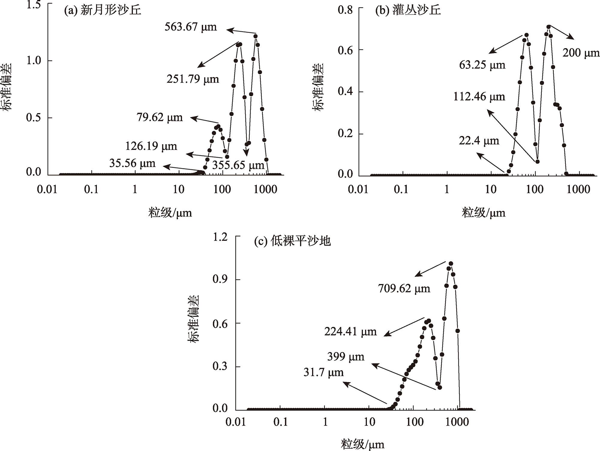 | 灌丛沙丘 | 平均粒径/μm | 81.317 | 124.129 | 95.600±1.340 |