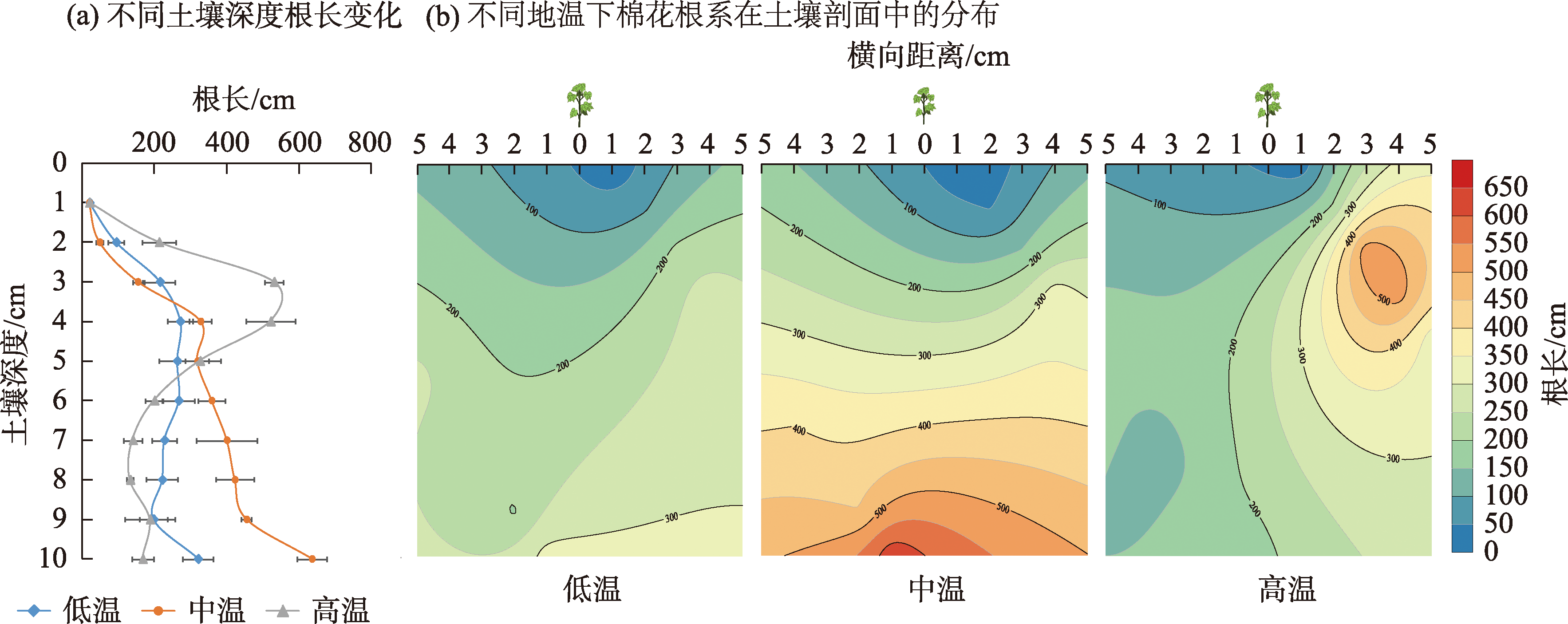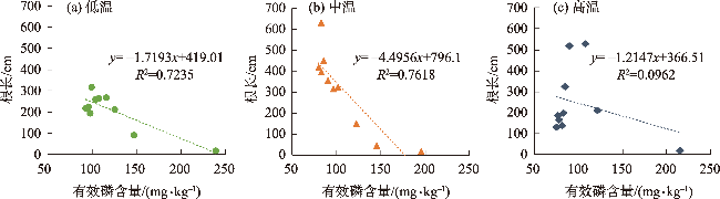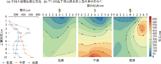 This study examines cotton growth affected by soil temperature under the condition of phosphate fertilizer drip application. It also explores the role and mechanism of soil temperature regulation of cotton root growth on improving the utilization rate of cotton phosphate fertilizer. Using potted tests, three soil temperature gradients were examined: low temperature (LT: 11-18 ℃), medium temperature (MT: 22-26 ℃), and high temperature (HT: 30-34 ℃). Single factor testing with water bath temperature control was utilized. The effects of various soil temperatures on the growth traits, biomass, root distribution, effective soil phosphorus distribution, and phosphate utilization efficiency in cotton were assessed. As soil temperature increased, cotton plant height, stem thickness, leaf number and biomass all showed parabolic changes that peaked in the medium temperature (22-26 ℃) group. Additionally, root length in the 0 to 5 cm soil layer increased with soil temperature, most notably with high temperature treatment, followed by low temperature and medium temperature treatments increasing by 5.2%-126.9% and 4.9%-62.3%, respectively. Below the 5 cm soil layer, root length decreased with increasing temperature, with the medium temperature treatment having the longest root length, 81.68%-98.43%, which was 170.17%-218.35% longer than the low temperature and high temperature treatment, respectively. The effective P content of each treatment increased with lower temperatures, with the medium and high temperature treatment content being 13.7% and 20.5% lower than the low temperature treatment, respectively. Phosphorus absorption and phosphate utilization were maximized in the medium temperature cotton, followed by the low temperature cotton. With the lowest high temperature, the total phosphorus absorption in the medium temperature cotton increased relatively by 49.69% and 89.36% compared with low temperature and high temperature treatments, respectively. Furthermore, the phosphate utilization rate was twice and 50% higher than the high and low temperature treatments, respectively. These findings indicate that based on the effects of soil temperature on cotton growth, root and soil effective phosphorus distribution, phosphorus absorption, and phosphate utilization, the most suitable soil temperature for cotton growth is 22-26 ℃.