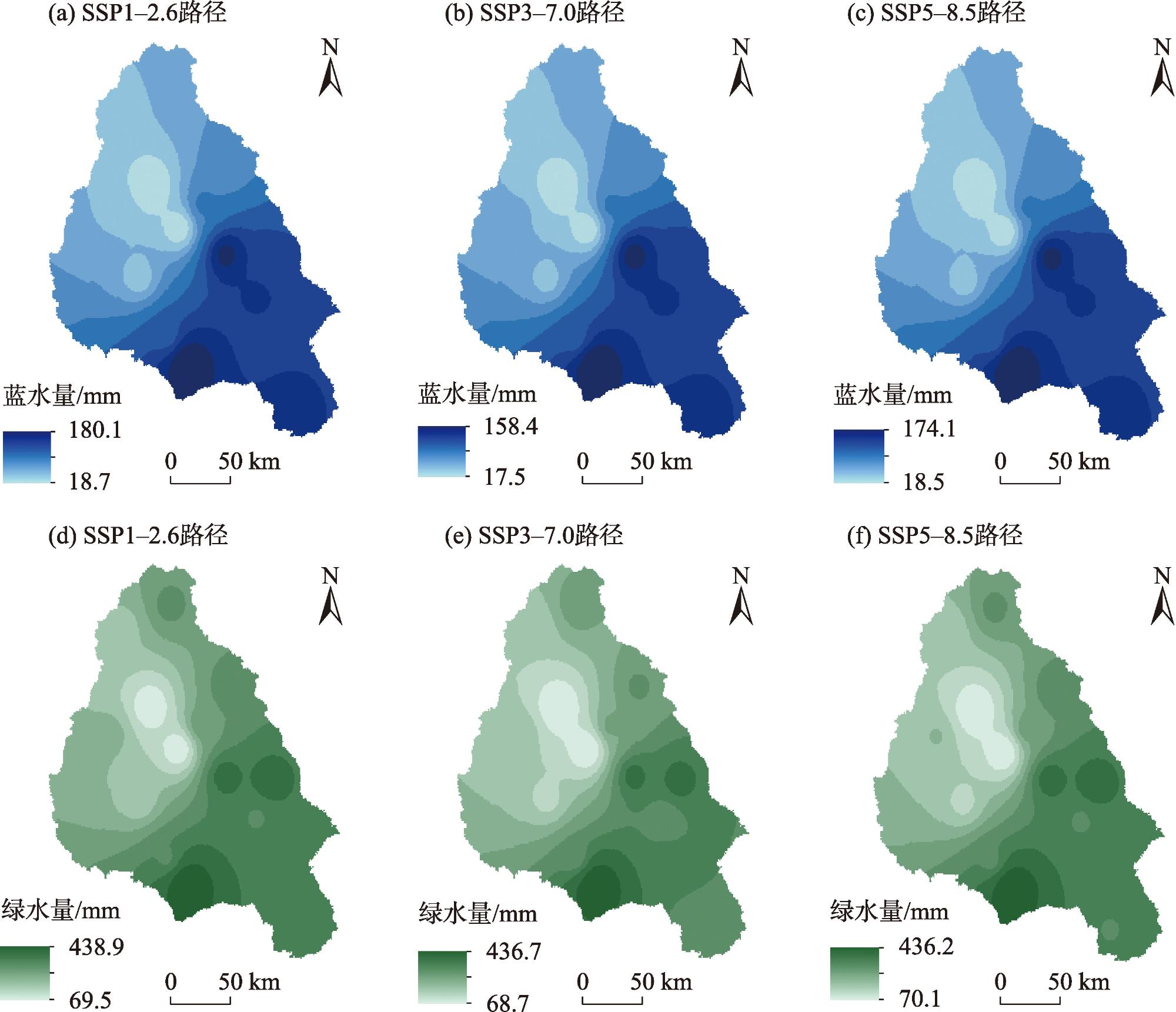 In this study, we analyzed meteorological data from 1980 to 2020, hydrological runoff data, and future climate models from CMIP6 in the Jinghe River Basin. The CMIP6 climate data was processed using the delta downscaling method and coupled with the Soil and Water Assessment Tool hydrological model to investigate the variations in blue-green water due to climate change in the basin. The results showed that under the SSP1-2.6 pathway, the blue-green water content in the study area exhibited an insignificant upward trend. Under the SSP3-7.0 pathway, the blue water content showed an insignificant downward trend, while the green water content showed a significant upward trend. Similarly, under the SSP5-8.5 pathway, the blue water content showed an insignificant downward trend, and the green water content also exhibited an insignificant upward trend. The average annual blue water volume under the three pathways decreased compared to the historical period, with annual averages of 128.8 mm, 117.2 mm, and 126 mm, respectively. Conversely, the average annual green water volume increased, recording values of 372.7 mm, 369.3 mm, and 372.1 mm, resulting in a green water coefficient higher than that of the historical period. The spatial distribution of blue-green water increased from northwest to southeast, with consistent spatial distribution characteristics across each pathway.
