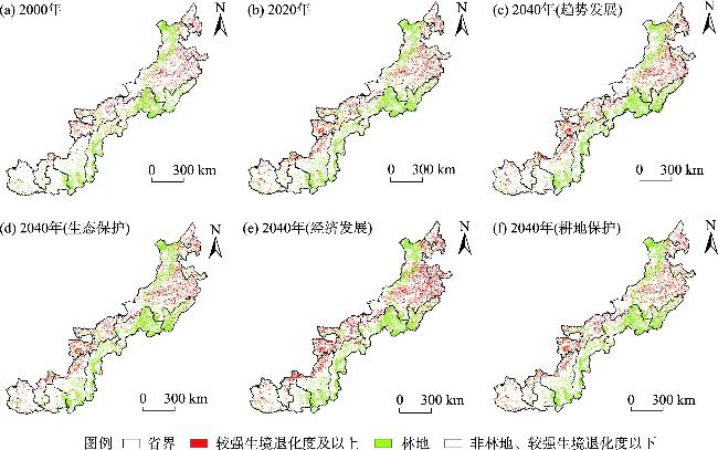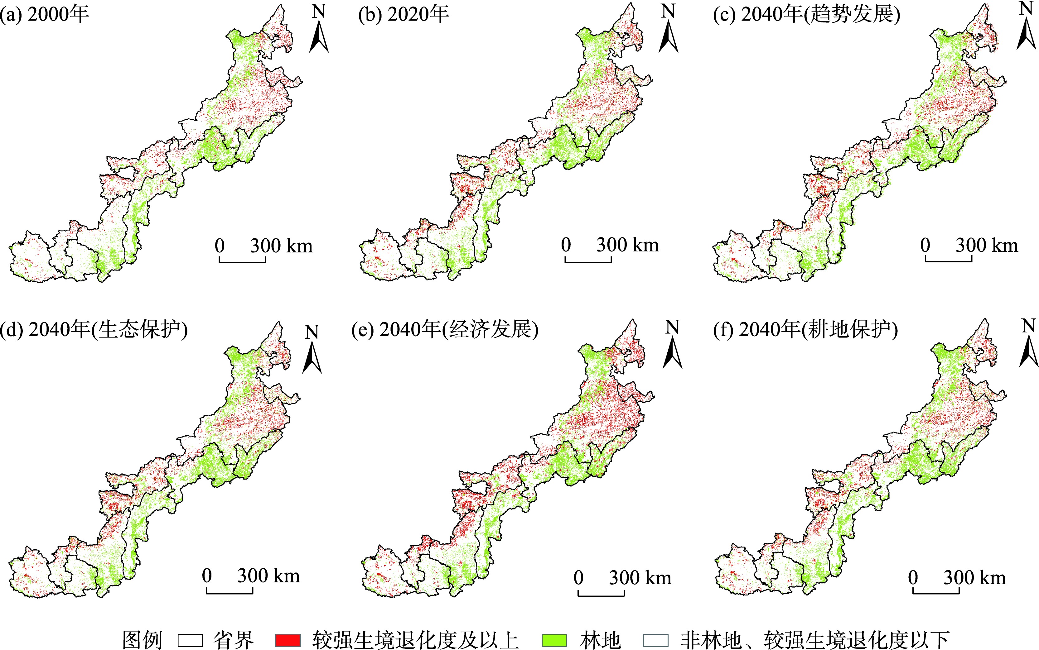 表6 2020年和2040年各情景下北方农牧交错带不同等级的生境质量面积Tab. 6 Different levels of habitat quality under different scenarios in 2040 and 2020 in the agro-pastoral ecotone of northern China /km2 |
