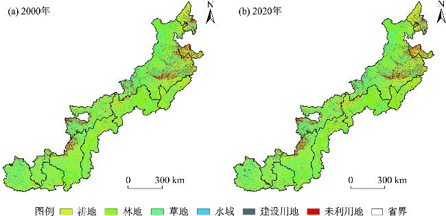 图2 2000年和2020年北方农牧交错带土地利用分布Fig. 2 Land use distribution of the agro-pastoral ecotone of northern China in 2000 and 2020 |