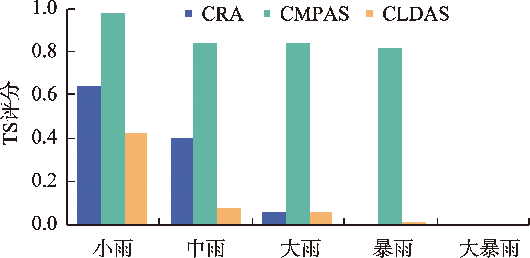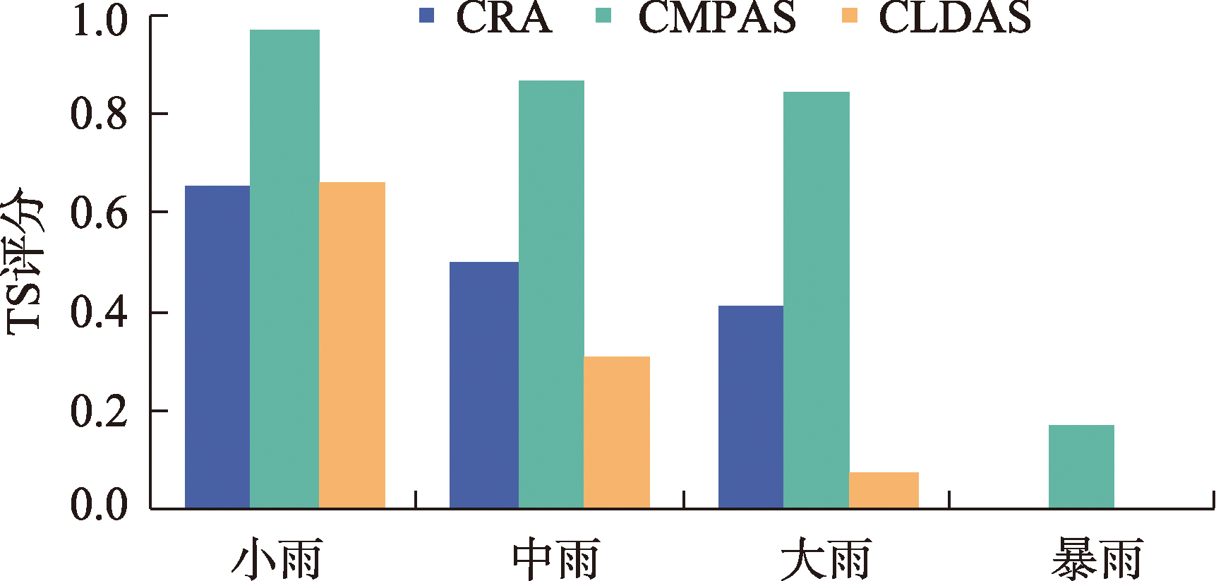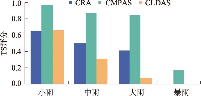 表1 2022年青藏高原东部三种降水产品评估指标Tab. 1 Evaluation indicators of three precipitation products in eastern Qinghai-Xizang Plateau in 2022 |