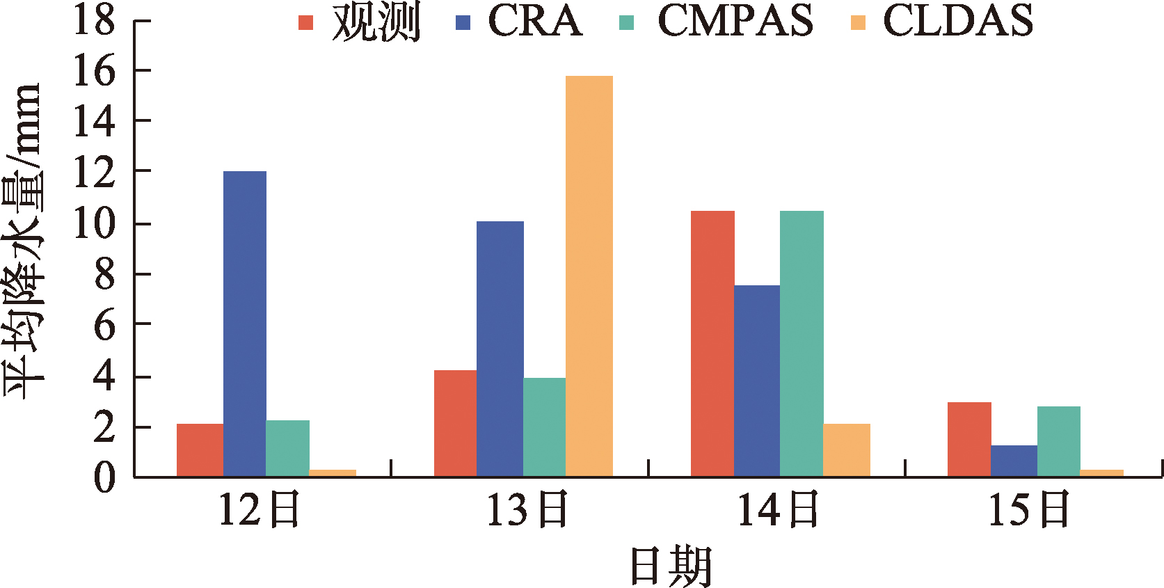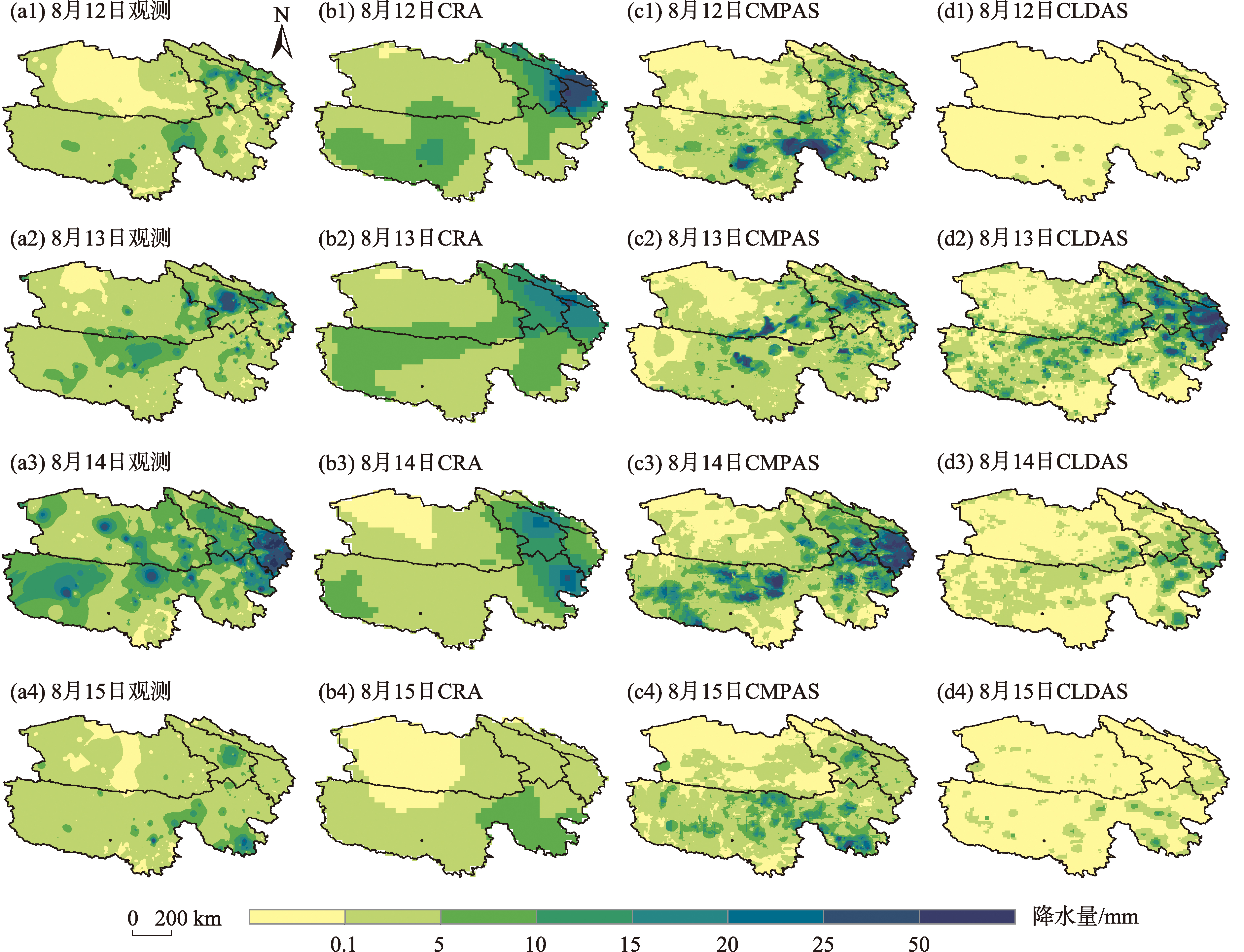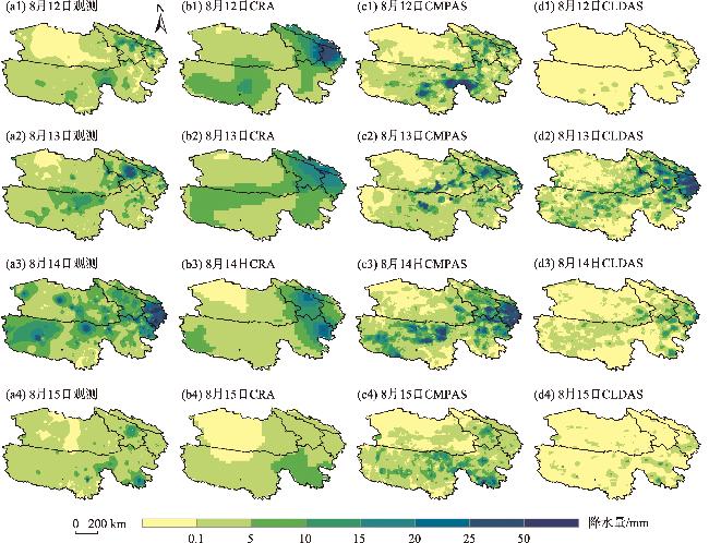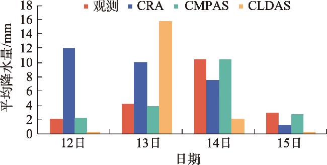 表3 2022年8月12—15日青藏高原东部三种降水产品评估指标Tab. 3 Evaluation indicators of three precipitation products in eastern Qinghai-Xizang Plateau during August 12-15, 2022 |