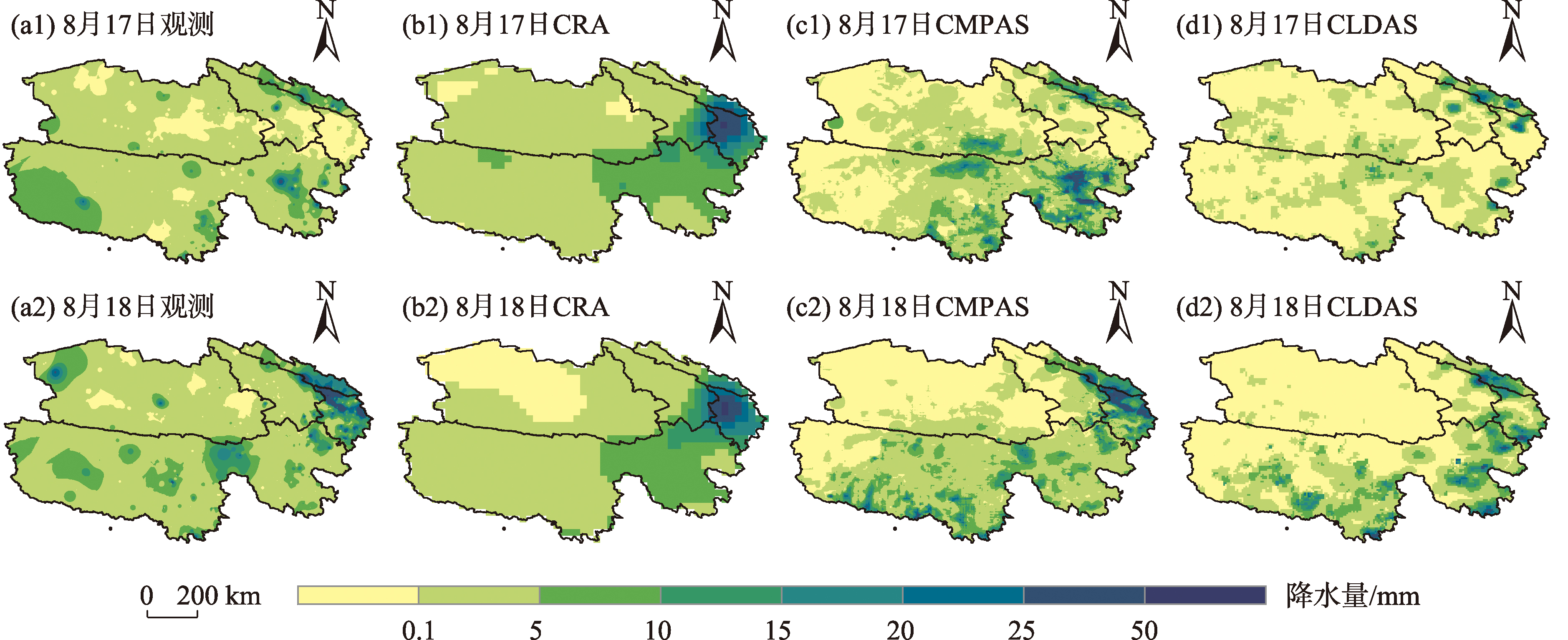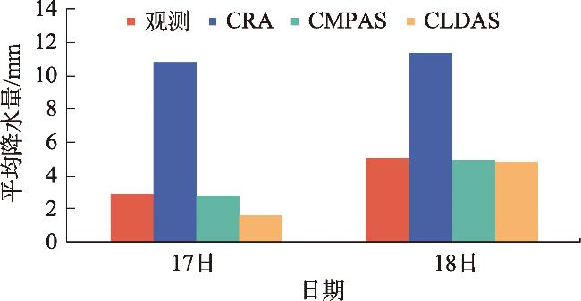 表4 2022年8月17—18日青藏高原东部三种降水产品评估指标Tab. 4 Evaluation indicators of three precipitation products in eastern Qinghai-Xizang Plateau during August 17-18, 2022 |