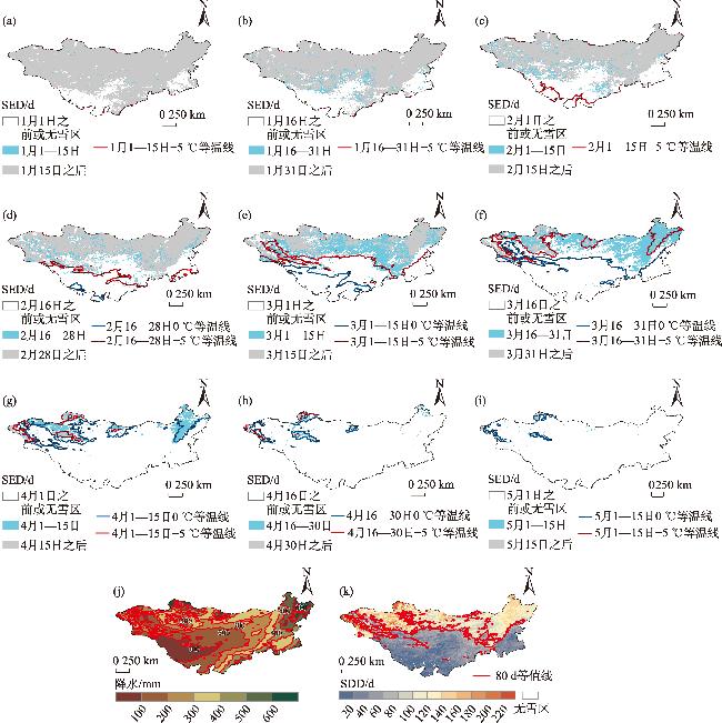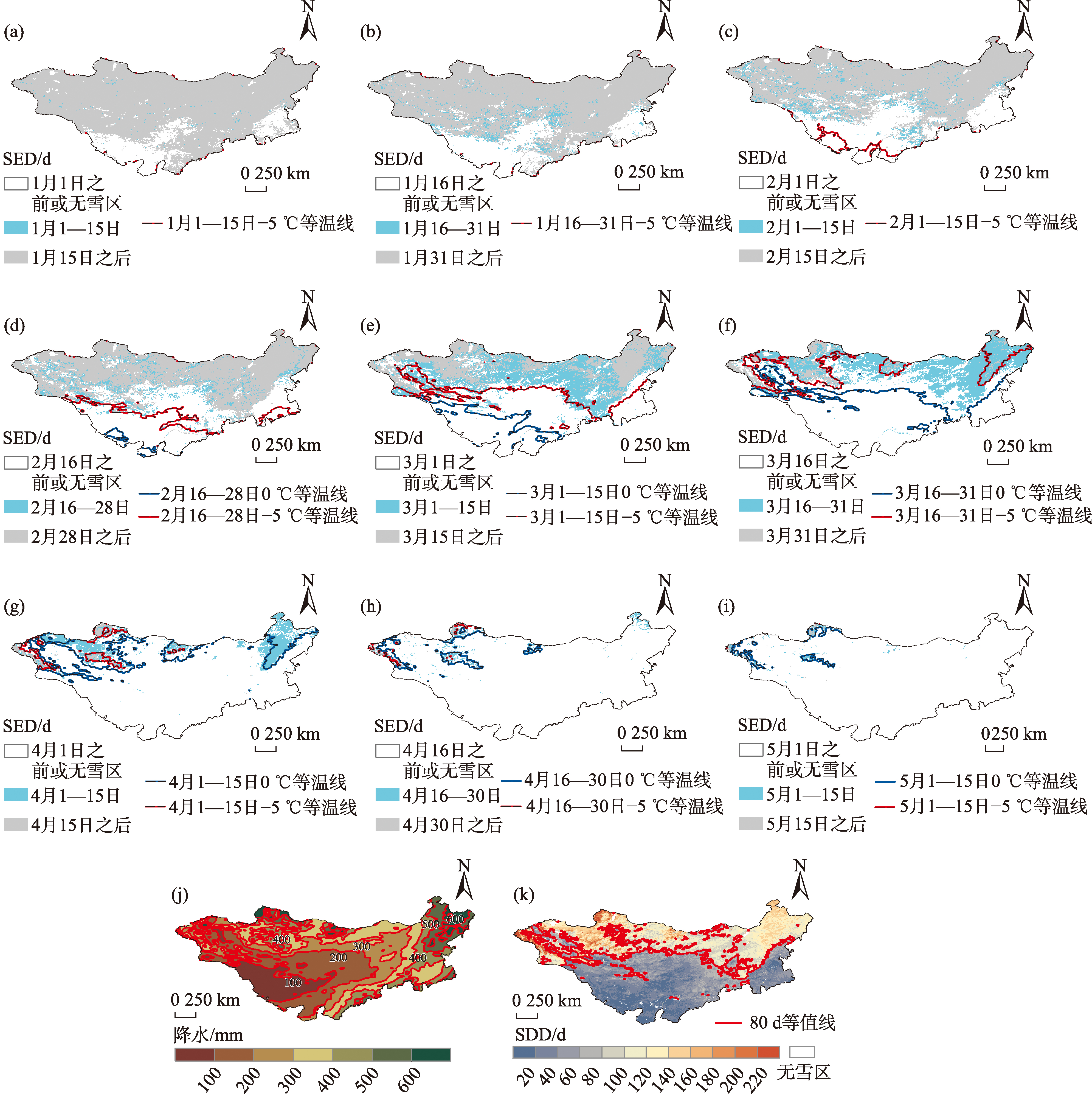图4 20 a来蒙古高原每隔15 d的SED与-5 ℃和0 ℃等温线的空间分布特征(a~i)以及年累积降水(j)和SDD空间分布(k)Fig. 4 Spatial distribution characteristics of SED in the Mongolian Plateau over the past 20 years at 15-day intervals, along with the -5 ℃ and 0 ℃ isotherms (a-i), as well as the annual cumulative precipitation (j) and SDD spatial distribution (k) |