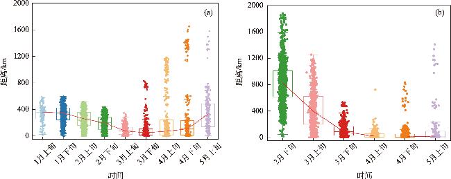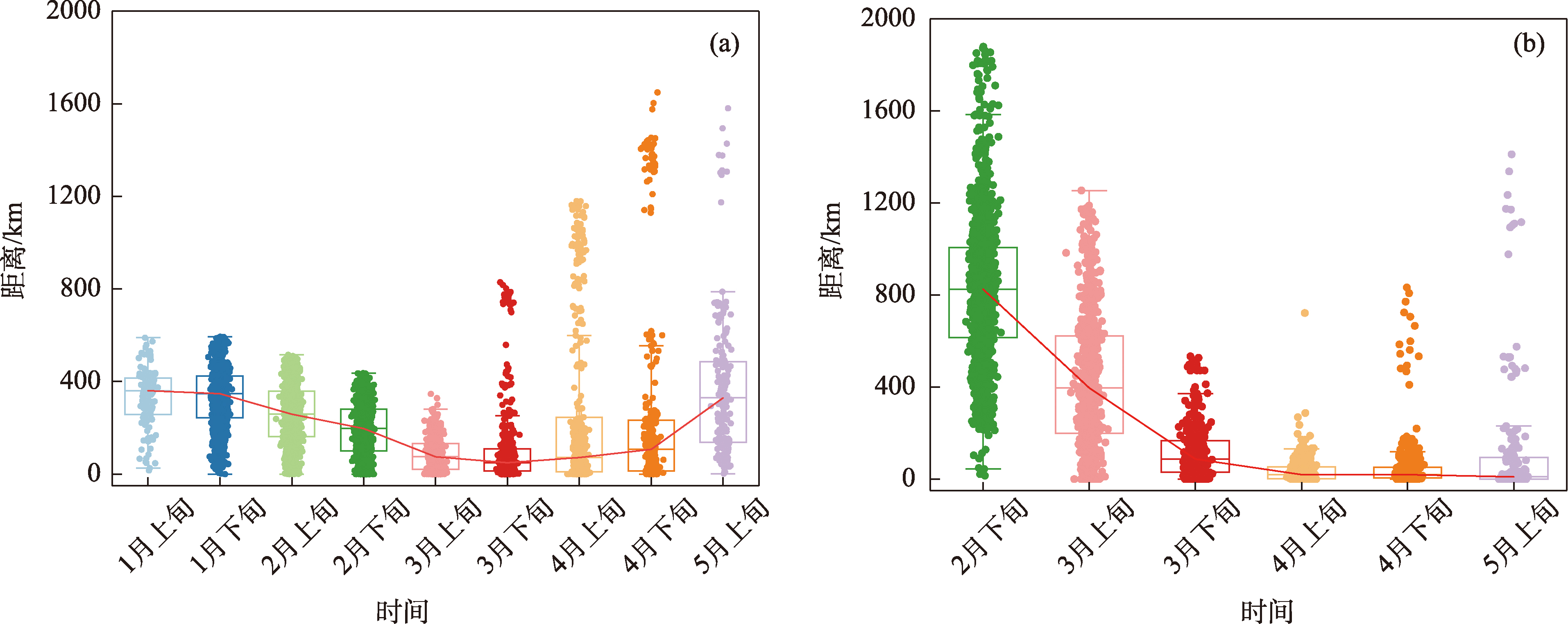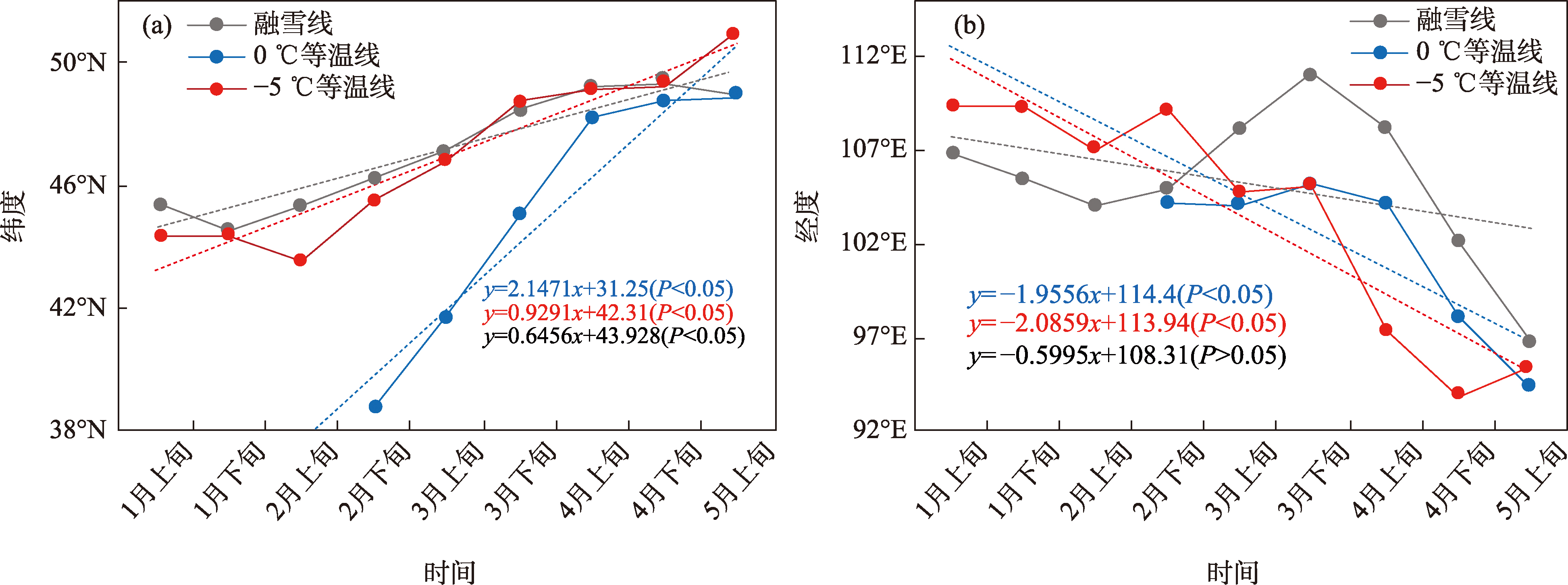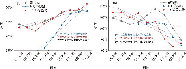 图5 每半月融雪线及0 ℃和-5 ℃等温线分别在纬度(a)及经度(b)上的移动Fig. 5 Movement of the snow-melt line, as well as the 0 ℃ and -5 ℃ isotherms, in latitude (a) and longitude (b) every half-month |