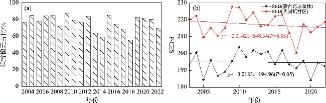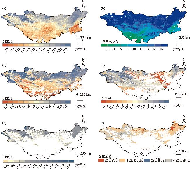 图3 2003—2022年蒙古高原多年平均SED空间分布及对应的降雪频次(a~b)及2009年、2018年SED空间分布(c~d)和稳定积雪区多年平均SED及其变化趋势(e~f)Fig. 3 Spatial distribution of multi-year average SED and corresponding snowfall frequency (a-b) over the Mongolian Plateau from 2003 to 2022, spatial distributions of SED in 2009 and 2018 (c-d), and multi-year average SED and its variation trend in the stable snow-covered area (e-f) |