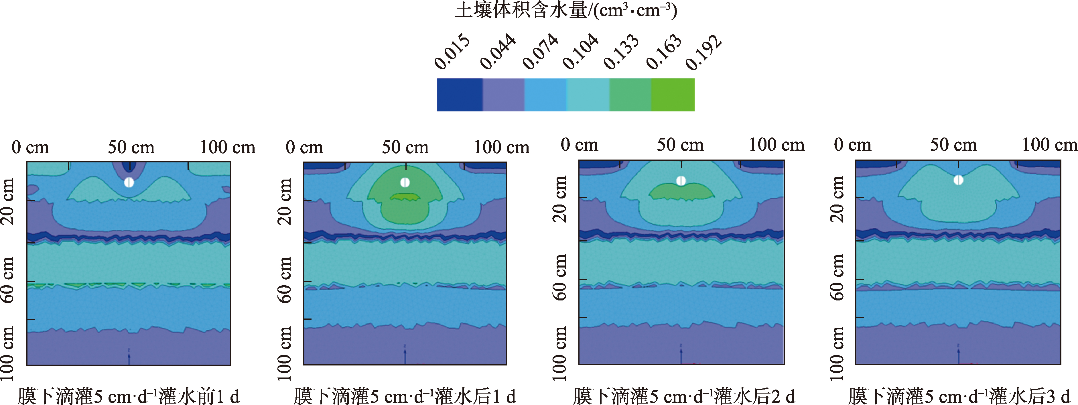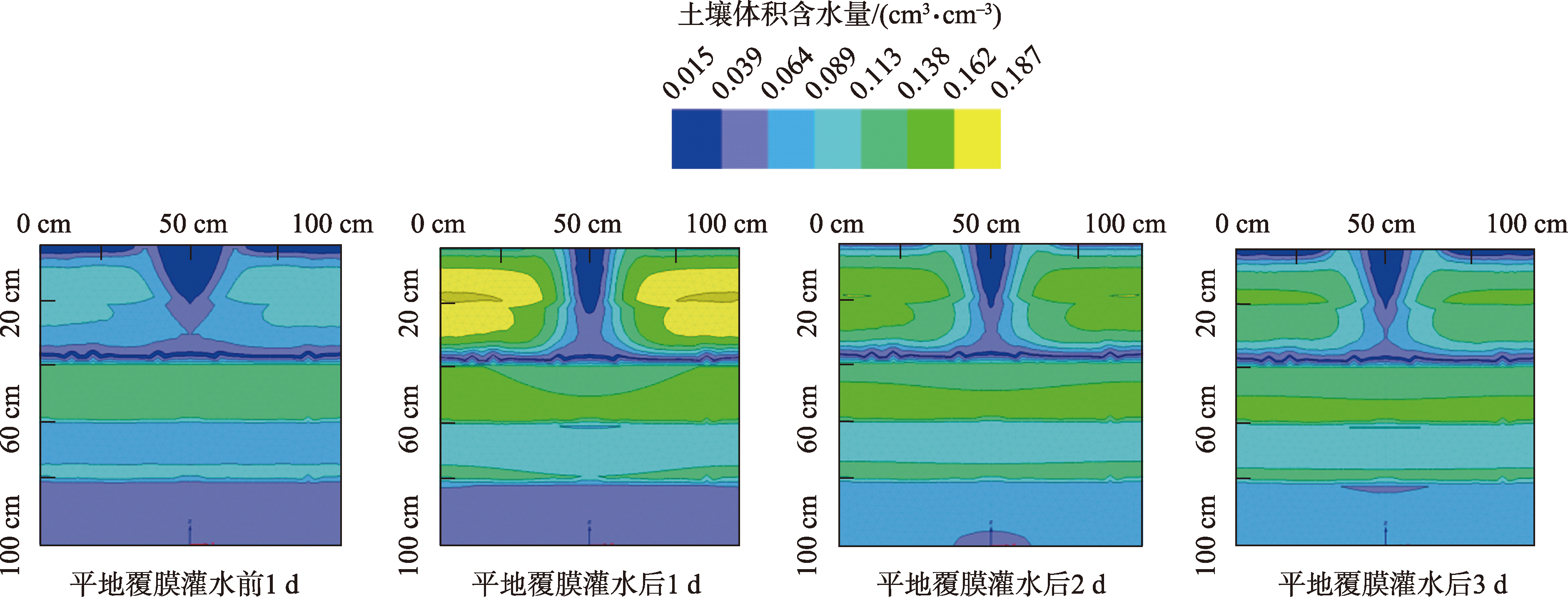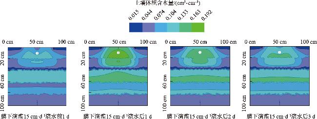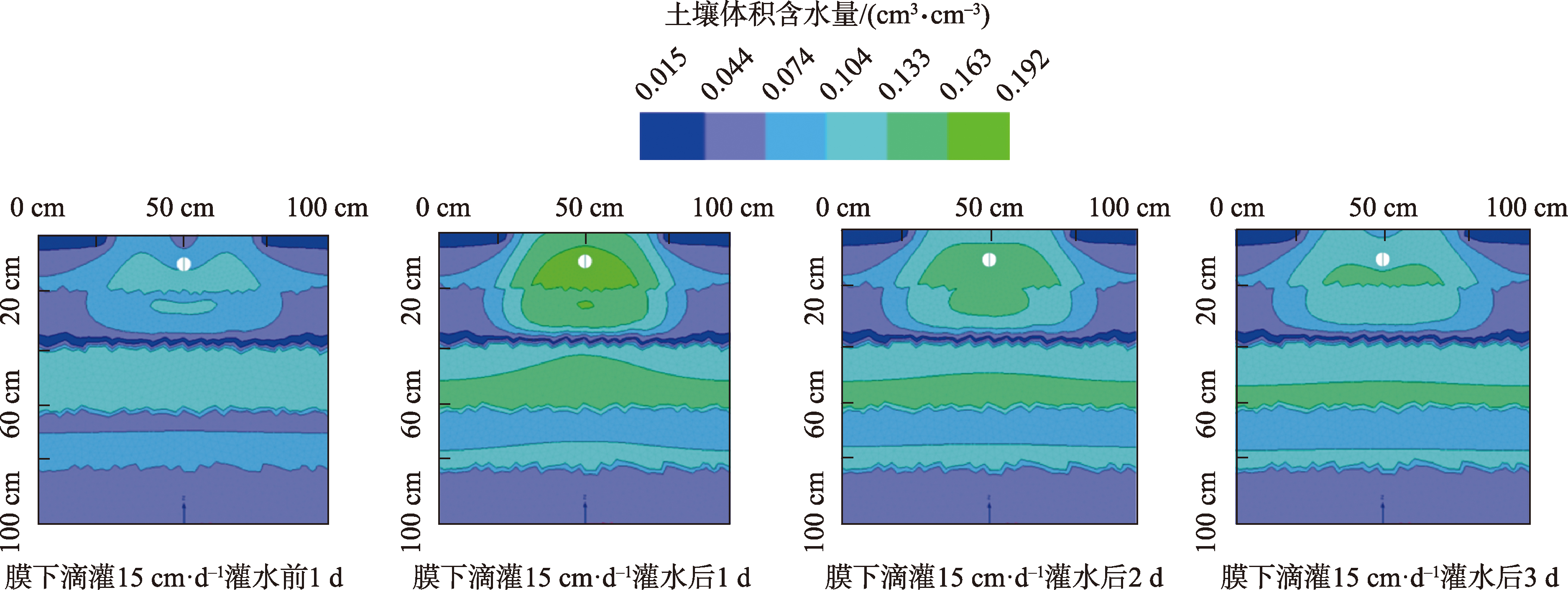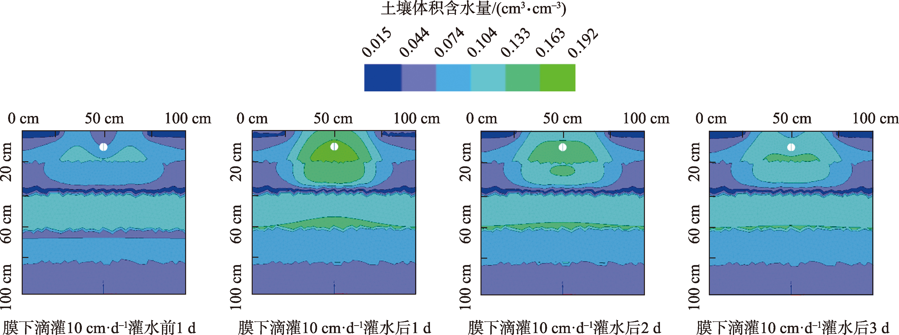 图10 膜下滴灌模式下土壤体积含水量时间序列HYDRUS-2D模型模拟Fig. 10 Simulation of soil volumetric water content time series HYDRUS-2D model under drip irrigation mode |