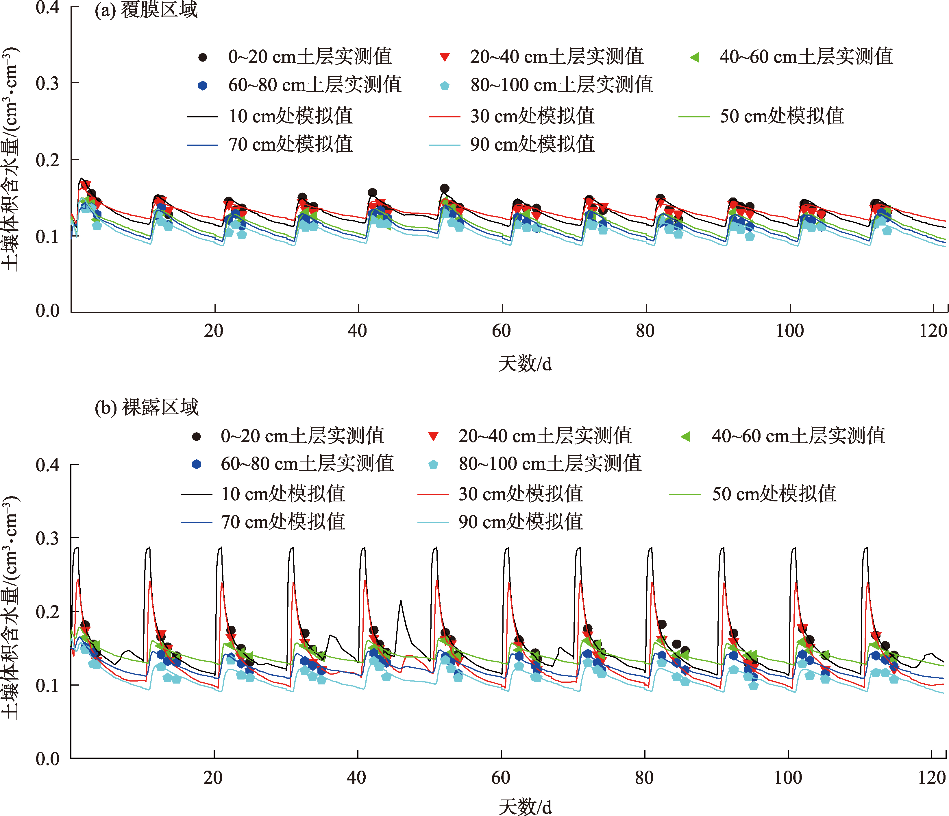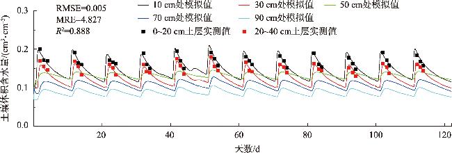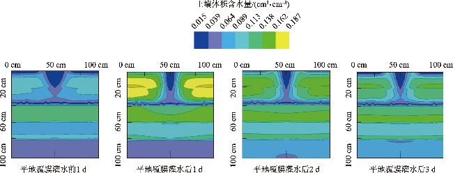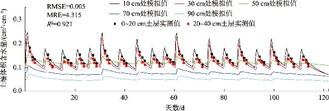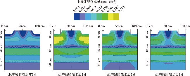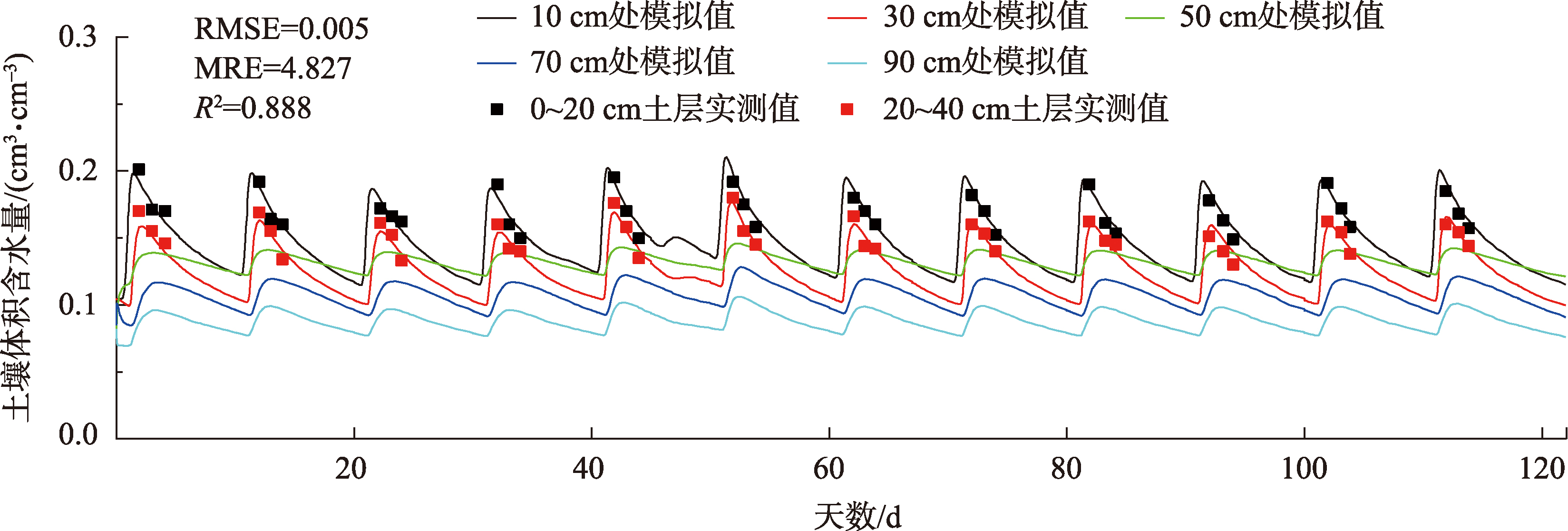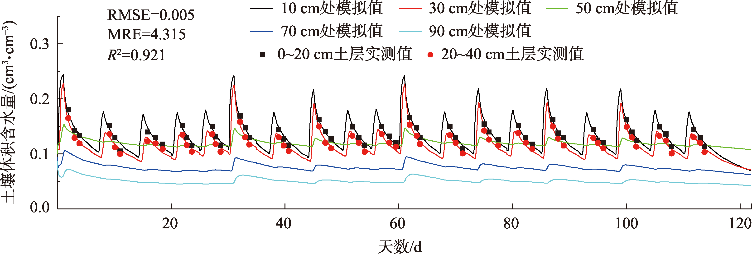 图10 膜下滴灌模式下土壤体积含水量时间序列HYDRUS-2D模型模拟Fig. 10 Simulation of soil volumetric water content time series HYDRUS-2D model under drip irrigation mode |