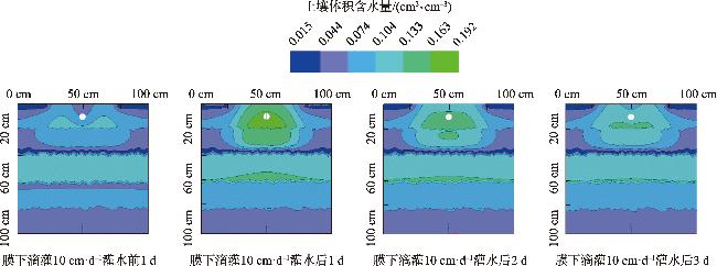 图12 10 cm·d-1滴灌水头下土壤体积含水量空间分布Fig. 12 Spatial distribution of soil volume water content under 10 cm·d-1 drip irrigation head |