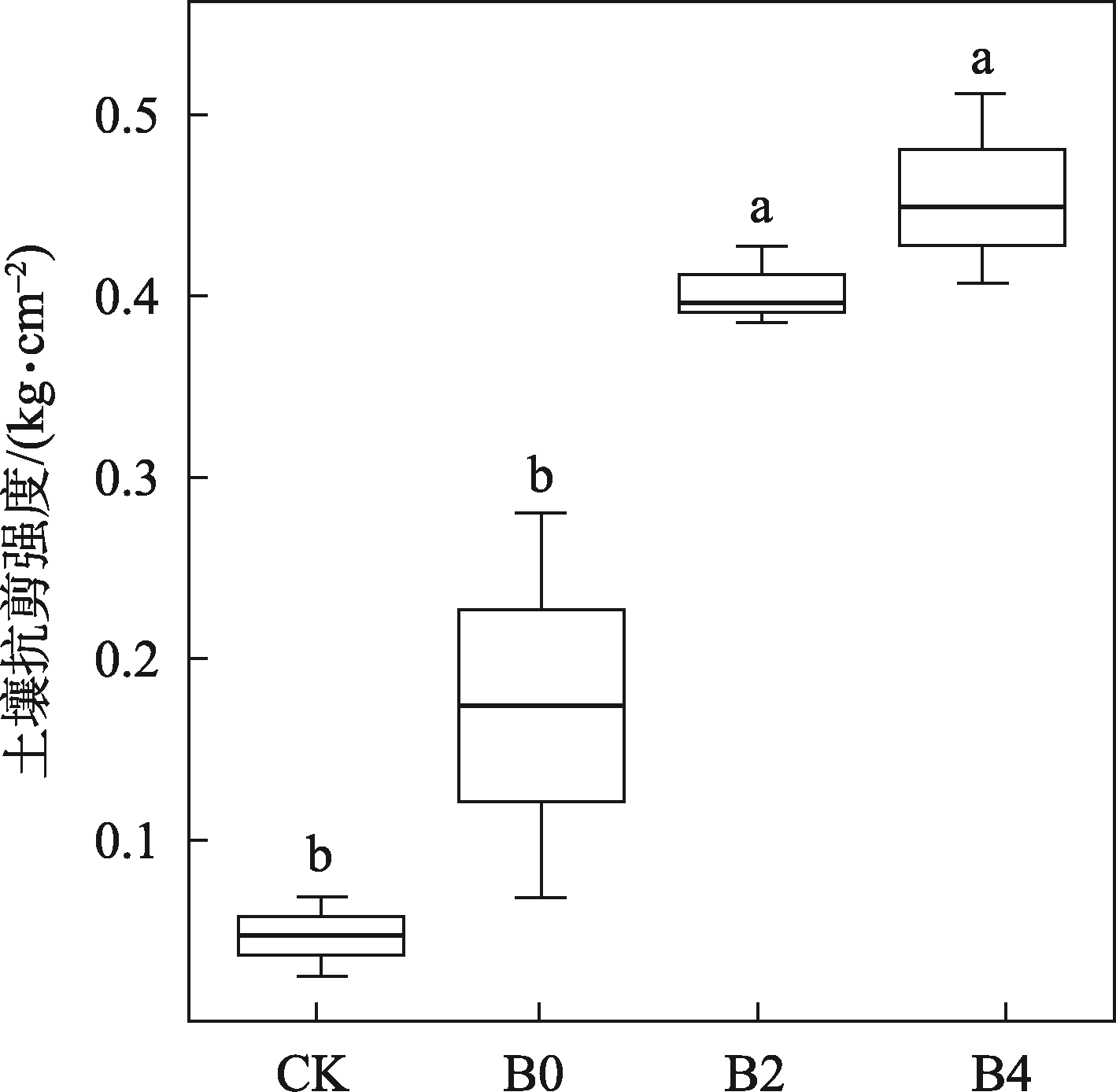 图3 不同配比膨润土处理下的抗剪强度注:CK为未经人为干扰的原生环境对照。下同。 Fig. 3 Shear strength of bentonite treated with different proportions |
