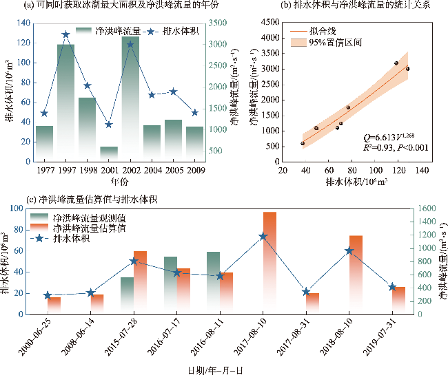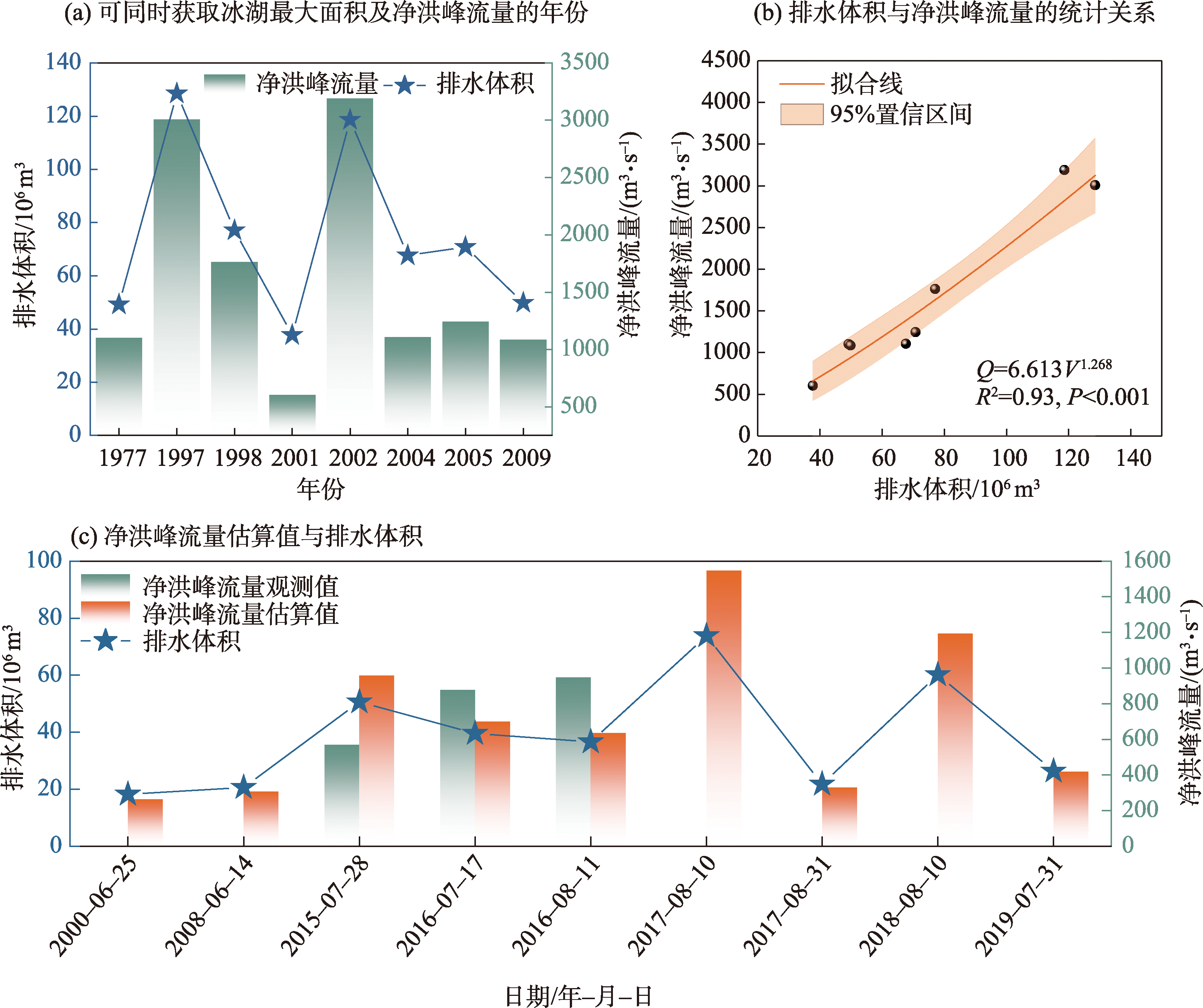 表3 冰湖突发洪水净洪峰流量估算及相对误差Tab. 3 Estimations of net peak discharge and relative error of glacial lake outburst floods |