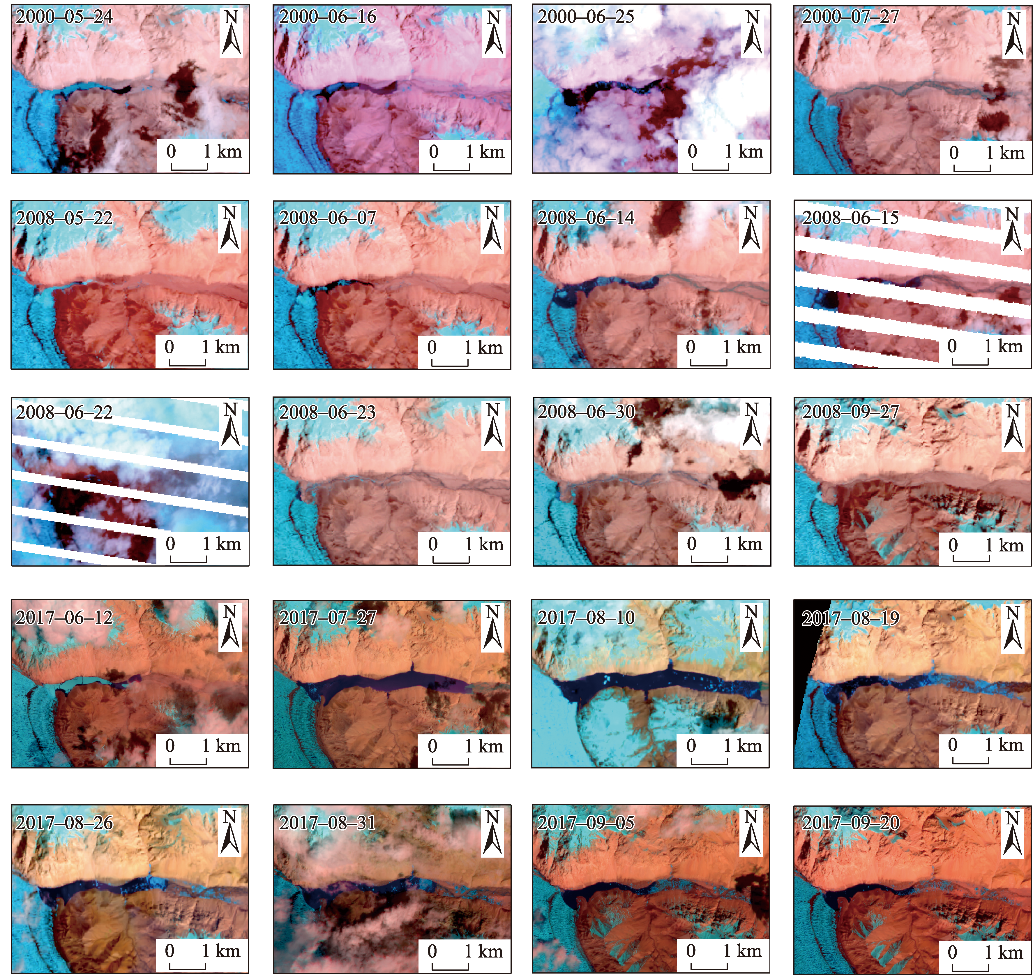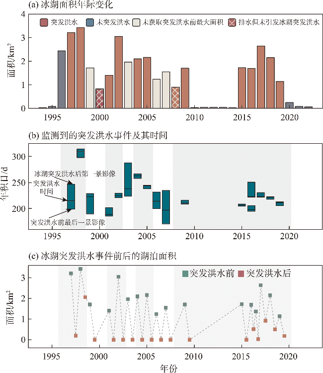 表2 1990—2023年克亚吉尔冰湖突发洪水事件Tab. 2 The Kyagar Glacial Lake outburst floods from 1990 to 2023 |