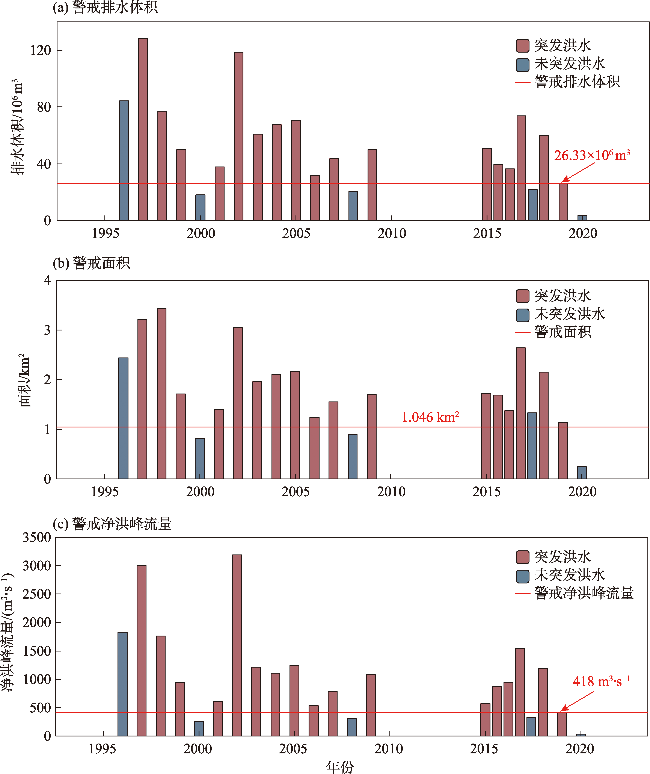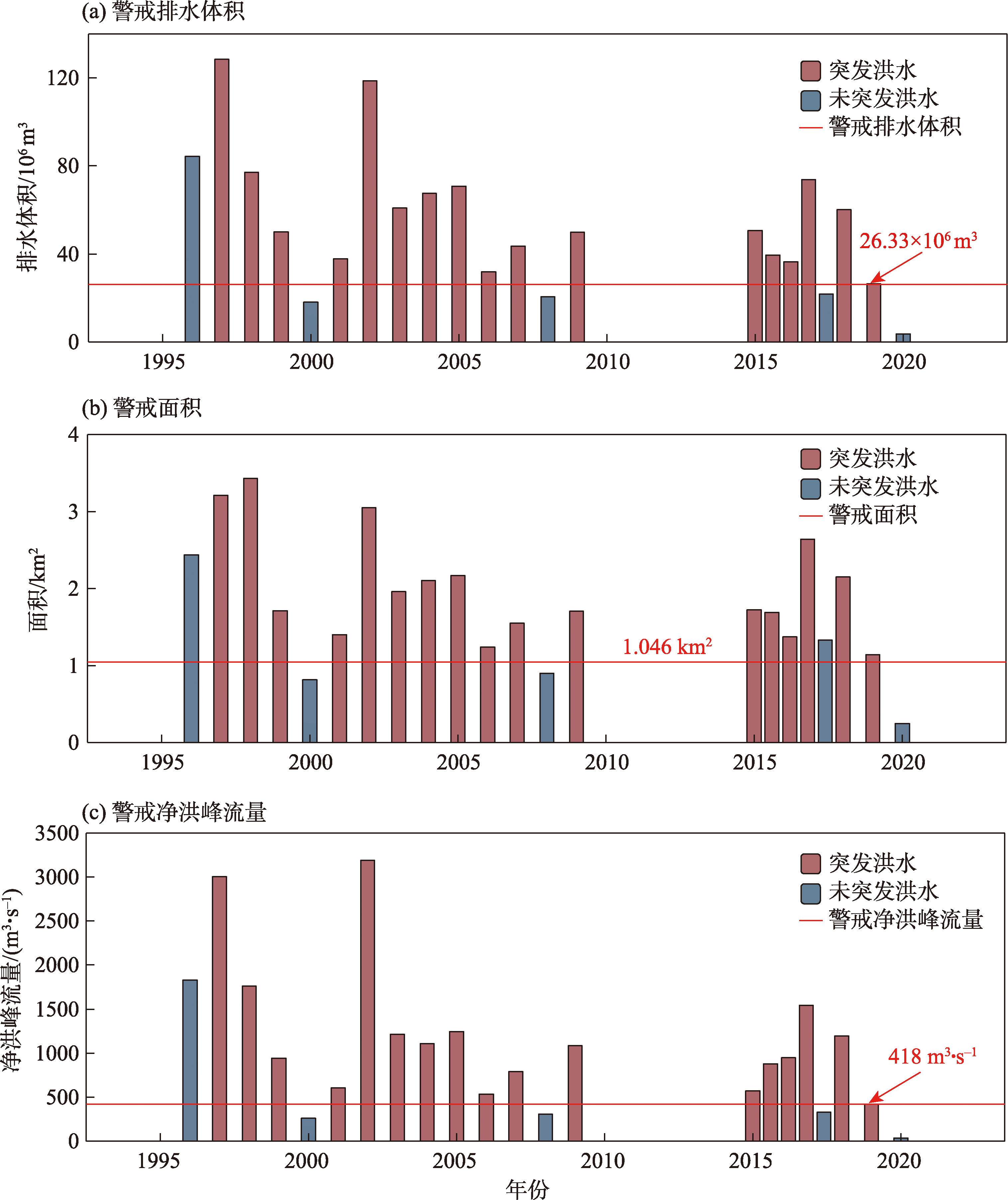 图7 克亚吉尔冰川阻塞湖警戒排水体积、警戒面积及警戒净洪峰流量Fig. 7 The alert drainage volume, alert area, and alert net peak discharge of the Kyagar Glacier-dammed Lake |