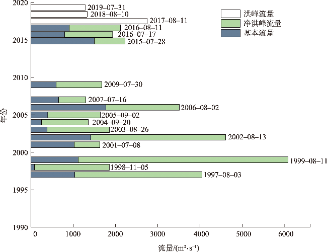 图2 1990—2023年卡群站克亚吉尔冰湖突发洪水洪峰流量Fig. 2 Peak discharge of Kyagar Glacial Lake outburst floods from 1990 to 2023 at Kaqun Station |